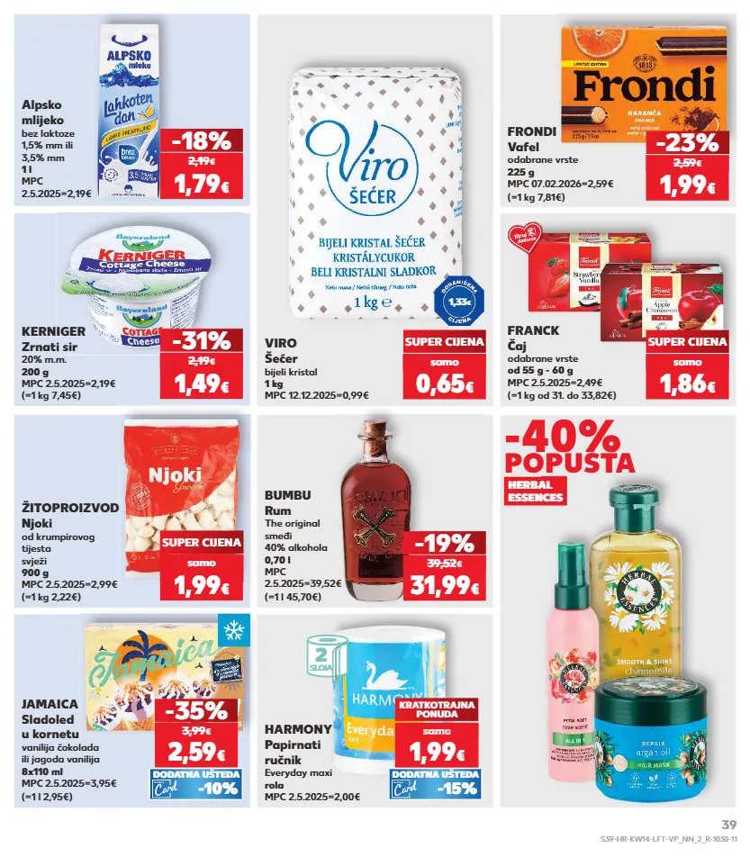 kratkotrajna ponuda kratkotrajna ponuda kratkotrajna ponuda kratkotrajna ponuda kratkotrajna ponuda samo samo samo samo samo kratkotrajna ponuda samo -10% dodatna ušteda -15% dodatna ušteda kratkotrajna ponuda kratkotrajna ponuda samo samo herbal essences -40% popusta frondi vafel odabrane vrste 225 g mpc 07.02.2026=2,59€ (=1 kg 7,81€) viro šećer bijeli kristal 1 kg mpc 12.12.2025=0,99€ super cijena -23% (=1 kg 7,45€) kerniger zrnati sir 20% m.m. 200 g mpc 2.5.2025=2,19€ -31% alpsko mlijeko bez laktoze 1,5% mm ili 3,5% mm 1 l mpc 2.5.2025=2,19€ -18% (=1 kg 2,22€) žitoproizvod njoki od krumpirovog tijesta svježi 900 g mpc 2.5.2025=2,99€ super cijena 0,65 € samo 1,99 € 2,59 € 1,49 € 2,19 € 1,79 € 2,19 € 1,99 € samo harmony papirnati ručnik everyday maxi rola mpc 2.5.2025=2,00€ kratkotrajna ponuda samo 1,99 € sa o 1,99 sam 1,99 sam 1,99 sam 1,99 sam sam € o € o (=1 l 2,95€) jamaica sladoled u kornetu vanilija čokolada ili jagoda vanilija 8x110 ml mpc 2.5.2025=3,95€ 2,59 € -35% 3,99 € bumbu rum the original smeđi 40% alkohola 0,70 l mpc 2.5.2025=39,52€ (=1 l 45,70€) franck čaj odabrane vrste od 55 g - 60 g mpc 2.5.2025=2,49€ (=1 kg od 31. do 33,82€) -19% super cijena 31,99 € 39,52 € 1,86 € samo 1,33 € -10% dodatna ušteda -15% dodatna ušteda 2 sloja s39-hr-kw14-lft-vp_nn_2_r-1030-11 39