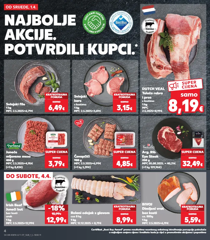 kratkotrajna ponuda kratkotrajna ponuda kratkotrajna ponuda kratkotrajna ponuda samo od srijede, 1.4. od srijede, 1.4. k v a l i t e t a p r e m i u m teletina k v a l i t e t a p r e m i u m junetina do subote, 4.4. svinjski kare s kostima 1 kg mpc 2.5.2025=3,69€ svinjski file 1 kg mpc 2.5.2025=6,79€ juneće mljeveno meso 450 g mpc 2.5.2025=4,95€ (=1 kg 8,43€) ćevapčići 900 g mpc 2.5.2025=6,99€ (=1 kg 5,39€) arg. rib eye steak 250 g mpc 05.08.2025. = 40,21€ (=1 kg 129,96€) irish beef juneći but bez kosti orah 1 kg mpc 2.5.2025=12,99€ bivoj dimljeni vrat bez kosti ca. 800g 1 kg mpc 2.5.2025=6,19€ č i s t a k v a l i t e t a kratkotrajna ponuda kratkotrajna ponuda super cijena super cijena -18% kratkotrajna ponuda super cijena samo 6,49 € samo 3,15 € rolani odojak s glavom cca 8 kg 1 kg mpc 12.12.2025 = 8,79€ kratkotrajna ponuda samo 8,99 € samo 3,79 € samo 4,85 € 12,99 € 15,99 € samo 5,59 € samo 32,49 € dutch veal teleća rebra i prsa s kostima 1 kg mpc 2.5.2025=8,99€ najbolje akcije. potvrdili kupci. * certifikat „best buy award“ prema rezultatima neovisnog anketnog istraživanja percepcije potrošača o najboljem omjeru cijene i kvalitete kada je riječ o promotivnim akcijama i popustima 8,19 8,19 € € samo super cijena s4-hr-kw14-lft-fp_sub_1_l-1030-11 4