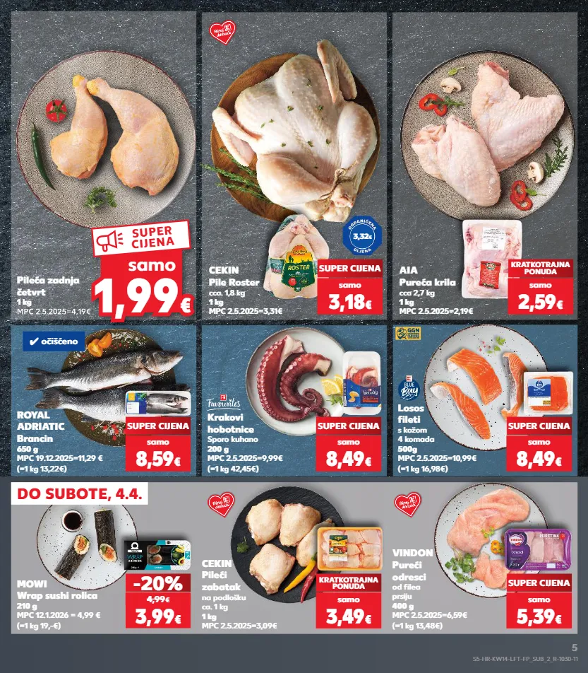 kratkotrajna ponuda kratkotrajna ponuda kratkotrajna ponuda kratkotrajna ponuda kratkotrajna ponuda kratkotrajna ponuda samo do subote, 4.4. royal adriatic brancin 650 g mpc 19.12.2025=11,29 € (=1 kg 13,22€) losos fileti s kožom 4 komada 500g mpc 2.5.2025=10,99€ (=1 kg 16,98€) super cijena super cijena mowi wrap sushi rolica 210 g mpc 12.1.2026 = 4,99 € (=1 kg 19,-€) cekin pileći zabatak na podlošku ca. 1 kg 1 kg mpc 2.5.2025=3,09€ vindon pureći odresci od filea prsiju 400 g mpc 2.5.2025=6,59€ (=1 kg 13,48€) -20% kratkotrajna ponuda super cijena cekin pile roster cca. 1,8 kg 1 kg mpc 2.5.2025=3,31€ super cijena pileća zadnja četvrt 1 kg mpc 2.5.2025=4,19€ aia pureća krila cca 2,7 kg 1 kg mpc 2.5.2025=2,19€ kratkotrajna ponuda samo 8,59 € samo 8,49 € krakovi hobotnice sporo kuhano 200 g mpc 2.5.2025=9,99€ (=1 kg 42,45€) super cijena samo 8,49 € 3,99 € 4,99 € samo 3,49 € samo 5,39 € samo 3,18 € samo 2,59 € 3,32 € ✓ očišćeno mpc 2.5.2025=4,19€ 1,99 1,99 € € samo super cijena s5-hr-kw14-lft-fp_sub_2_r-1030-11 5