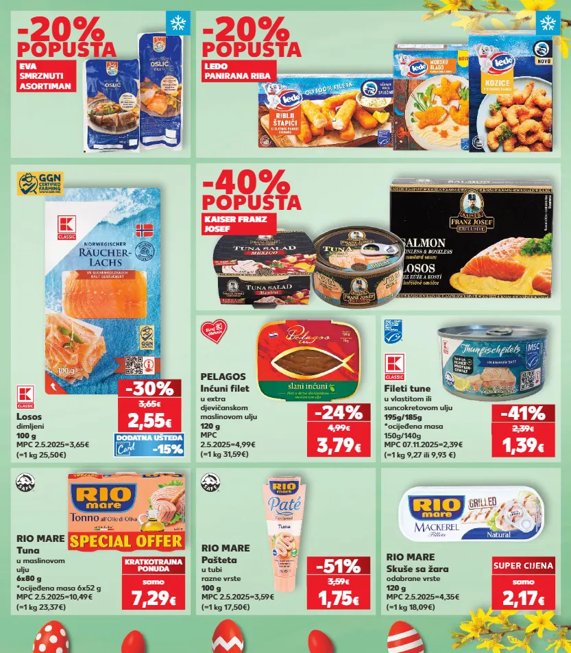 kratkotrajna ponuda kratkotrajna ponuda samo samo kratkotrajna ponuda samo kratkotrajna ponuda samo rio mare tuna u maslinovom ulju 6x80 g *ocijeđena masa 6x52 g mpc 2.5.2025=10,49€ (=1 kg 23,37€) kratkotrajna ponuda samo 7,29 € fileti tune u vlastitom ili suncokretovom ulju 195g/185g *ocijeđena masa 150g/140g mpc 07.11.2025=2,39€ (=1 kg 9,27 ili 9,93 €) -41% rio mare pašteta u tubi razne vrste 100 g mpc 2.5.2025=3,59€ (=1 kg 17,50€) rio mare skuše sa žara odabrane vrste 120 g mpc 2.5.2025=4,35€ (=1 kg 18,09€) -51% 1,39 € 2,39 € 1,75 € 3,59 € kratkotrajna ponuda super cijena super cijena super cijena - - super cijena 9% super cijena 9% 9% super cijena samo 2,17 € -24% (=1 kg 31,59€) pelagos inćuni filet u extra djevičanskom maslinovom ulju 120 g mpc 2.5.2025=4,99€ 3,79 € 4,99 € eva smrznuti asortiman -20% popusta ledo panirana riba -20% popusta kaiser franz josef -40% popusta losos dimljeni 100 g mpc 2.5.2025=3,65€ (=1 kg 25,50€) -30% 2,55 € 3,65 € -15% dodatna ušteda s7-hr-kw14-lft-aktf1_4_2_r-1030-11 7