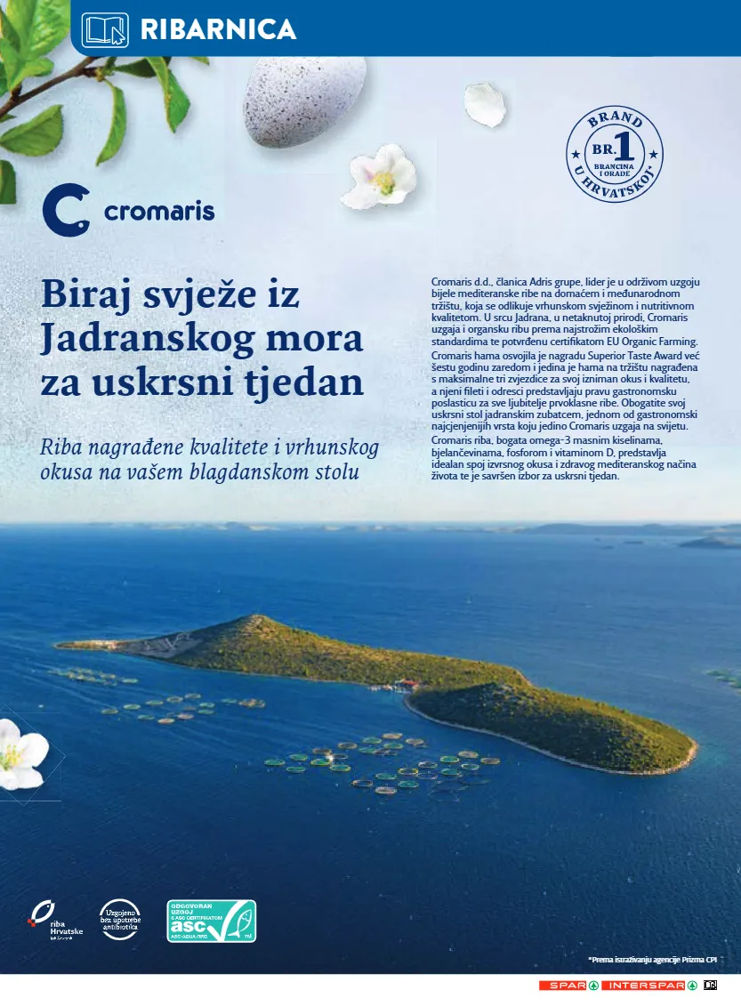 *prema istraživanju agencije prizma cpi cromaris d.d., članica adris grupe, lider je u održivom uzgoju bijele mediteranske ribe na domaćem i međunarodnom tržištu, koja se odlikuje vrhunskom svježinom i nutritivnom kvalitetom. u srcu jadrana, u netaknutoj prirodi, cromaris uzgaja i organsku ribu prema najstrožim ekološkim standardima te potvrđenu certifikatom eu organic farming. cromaris hama osvojila je nagradu superior taste award već šestu godinu zaredom i jedina je hama na tržištu nagrađena s maksimalne tri zvjezdice za svoj izniman okus i kvalitetu, a njeni fileti i odresci predstavljaju pravu gastronomsku poslasticu za sve ljubitelje prvoklasne ribe. obogatite svoj uskrsni stol jadranskim zubatcem, jednom od gastronomski najcjenjenijih vrsta koju jedino cromaris uzgaja na svijetu. cromaris riba, bogata omega-3 masnim kiselinama, bjelančevinama, fosforom i vitaminom d, predstavlja idealan spoj izvrsnog okusa i zdravog mediteranskog načina života te je savršen izbor za uskrsni tjedan. biraj svježe iz jadranskog mora za uskrsni tjedan riba nagrađene kvalitete i vrhunskog okusa na vašem blagdanskom stolu ribarnica