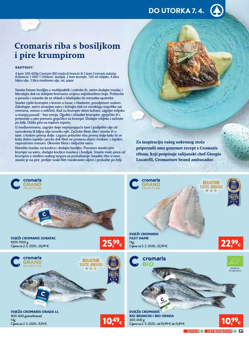 svježi cromaris zubatac 1000-1500 g cijena na 2. 5. 2025.: 26,99 € svježi cromaris filet hame 1 kg cijena na 5. 2. 2026.: 22,99 € svježa cromaris orada ll 400-600 grama/komad 1 kg cijena na 2. 5. 2025.: 11,19 € svježa cromaris bio brancin i bio orada 300-600 g cijena na 2. 5. 2025.: od 10,99 € do 11,49 € za inspiraciju vašeg uskrsnog stola pripremili smo gourmet recept s cromaris ribom, koji potpisuje talijanski chef giorgio locatelli, cromarisov brand ambasador. cromaris riba s bosiljkom i pire krumpirom 4 kom 300-600g cromaris bio orada ili brancin ili 2 kom cromaris zubatac ili brancin 1.000-1.500kom, bosiljak, 2 kom krumpir, 100 ml mlijeko, 4 žlice biljno ulje, 3 žlice maslinovo ulje, sol, papar : stavite listove bosiljka u multipraktik i usitnite ih, zatim dodajte maslac i blendajte dok ne dobijete kremastu smjesu svijetlozelene boje. prebacite u posudu i ostavite da se ohladi u hladnjaku do trenutka upotrebe. stavite cijele krumpire s korom u lonac s hladnom, posoljenom vodom. zakuhajte, zatim smanjite vatru i kuhajte dok ne omekšaju (otprilike sat vremena, ovisno o veličini). kad su krumpiri skoro kuhani, zagrijte mlijeko u manjoj posudi – bez vrenja. ogulite i ohladite krumpire, zgnječite ih i pretvorite u pire pomoću gnječilice za krumpir. dodajte mlijeko i začinite po želji. držite pire na toplom mjestu. u međuvremenu, zagrijte dvije neprijanjajuće tave i podijelite ulje od suncokreta ili biljno ulje između njih. začinite filete ribe i stavite ih u tave, s kožom prema dolje. lagano pritisnite ribu prema dolje kako bi se koža dobro ispekla i pecite dok fileti ne postanu zlatni i hrskavi, s bijelim, neprozirnim mesom. okrenite filete i isključite vatru. narežite maslac na kockice i dodajte bosiljku. ponovno stavite pire krumpir na vatru, dodajte kockice maslaca i bosiljak. stavite malo pirea od krumpira u sredinu svakog tanjura za posluživanje. izvadite ribu iz tave, stavite je na pire, prelijte svaki filet maslinovim uljem i poslužite po želji. 10 , 49 € 25 , 99 € 10 , 99 € 22 , 99 € do utorka 7. 4.