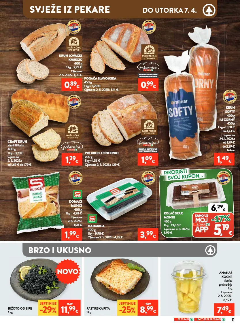 11 iskoristi svoj kupon... svoj kupon... ananas kocke vlastita proizvodnja 1 kg cijena na 2. 5. 2025.: 8,49 € kolač spar monte 460 g 1 kg = 13,67 € cijena na 2. 5. 2025.: 5,99 € domaći mlinci 400 g 1 kg = 4,98 € cijena na 2. 5. 2025.: 1,98 € mađarica 400 g 1 kg = 9,98 € cijena na 2. 5. 2025.: 4,39 € jeftinije -29 % 16,99 11 , 99 € jeftinije -25 % 11,99 8 , 99 € craft kruh zlatni ili karla 400 g 1 kg = 3,23 € cijena na 2. 5. 2025.: od 1,69 € do 1,79 € pogača slavonska 450 g 1 kg = 2,20 € cijena na 2. 5. 2025.: 1,14 € kruh softy 400 g ili corny 450 g 1 kg od 3,31 € do 3,73 € cijena na 24. 1. 2026.: od 1,99 € do 2,29 € mlinar kruh lovački kruščić 400 g 1 kg = 2,23 € cijena na 2. 5. 2025.: 1,05 € polubijeli fini kruh 700 g 1 kg = 1,56 € cijena na 2. 5. 2025.: 1,29 € pastirska pita 1 kg rižoto od sipe 1 kg brzo i ukusno 3 , 99 € 1 , 49 € 1 , 99 € 6 , 29 € , samo uz 5 , 19 € -17% novo 7 , 49 € 1 , 29 € 0 , 89 € 0 , 99 € samo u interspar hipermarketima samo u interspar hipermarketima 1 , 09 € svježe iz pekare do utorka 7. 4.