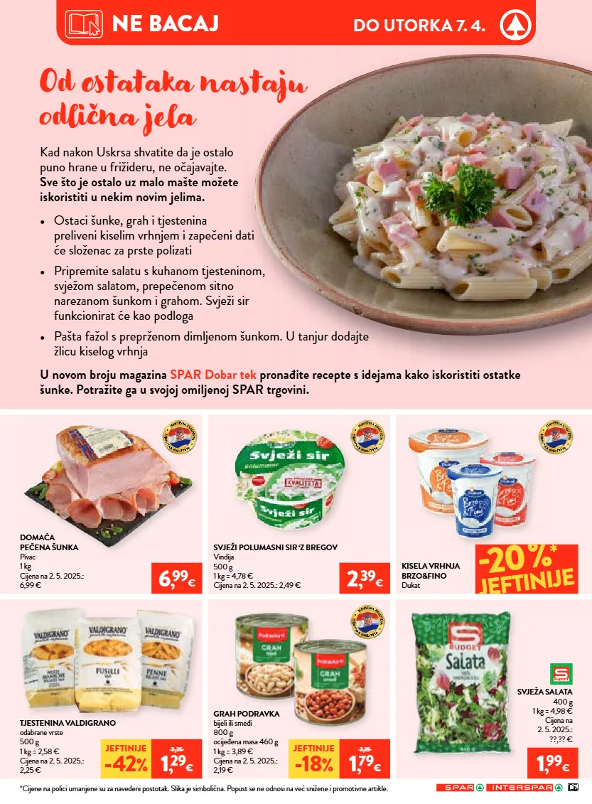 *cijene na polici umanjene su za navedeni postotak. slika je simbolična. popust se ne odnosi na već snižene i promotivne artikle. do utorka 7. 4. ne bacaj od tataka ntaju odlična jela kad nakon uskrsa shvatite da je ostalo puno hrane u frižideru, ne očajavajte. sve što je ostalo uz malo mašte možete iskoristiti u nekim novim jelima. • ostaci šunke, grah i tjestenina preliveni kiselim vrhnjem i zapečeni dati će složenac za prste polizati • pripremite salatu s kuhanom tjesteninom, svježom salatom, prepečenom sitno narezanom šunkom i grahom. svježi sir funkcionirat će kao podloga • pašta fažol s preprženom dimljenom šunkom. u tanjur dodajte žlicu kiselog vrhnja u novom broju magazina spar dobar tek pronađite recepte s idejama kako iskoristiti ostatke šunke. potražite ga u svojoj omiljenoj spar trgovini. svježa salata 400 g 1 kg = 4,98 € cijena na 2. 5. 2025.: ??,?? € kisela vrhnja brzo&fino dukat tjestenina valdigrano odabrane vrste 500 g 1 kg = 2,58 € cijena na 2. 5. 2025.: 2,25 € grah podravka bijeli ili smeđi 800 g ocijeđena masa 460 g 1 kg = 3,89 € cijena na 2. 5. 2025.: 2,19 € domaća pečena šunka pivac 1 kg cijena na 2. 5. 2025.: 6,99 € svježi polumasni sir ‘z bregov vindija 500 g 1 kg = 4,78 € cijena na 2. 5. 2025.: 2,49 € jeftinije -42 % 2,25 1 , 29 € jeftinije -18 % 2,19 1 , 79 € 20% * jeftinije 1 , 99 € 2 , 39 € 6 , 99 €