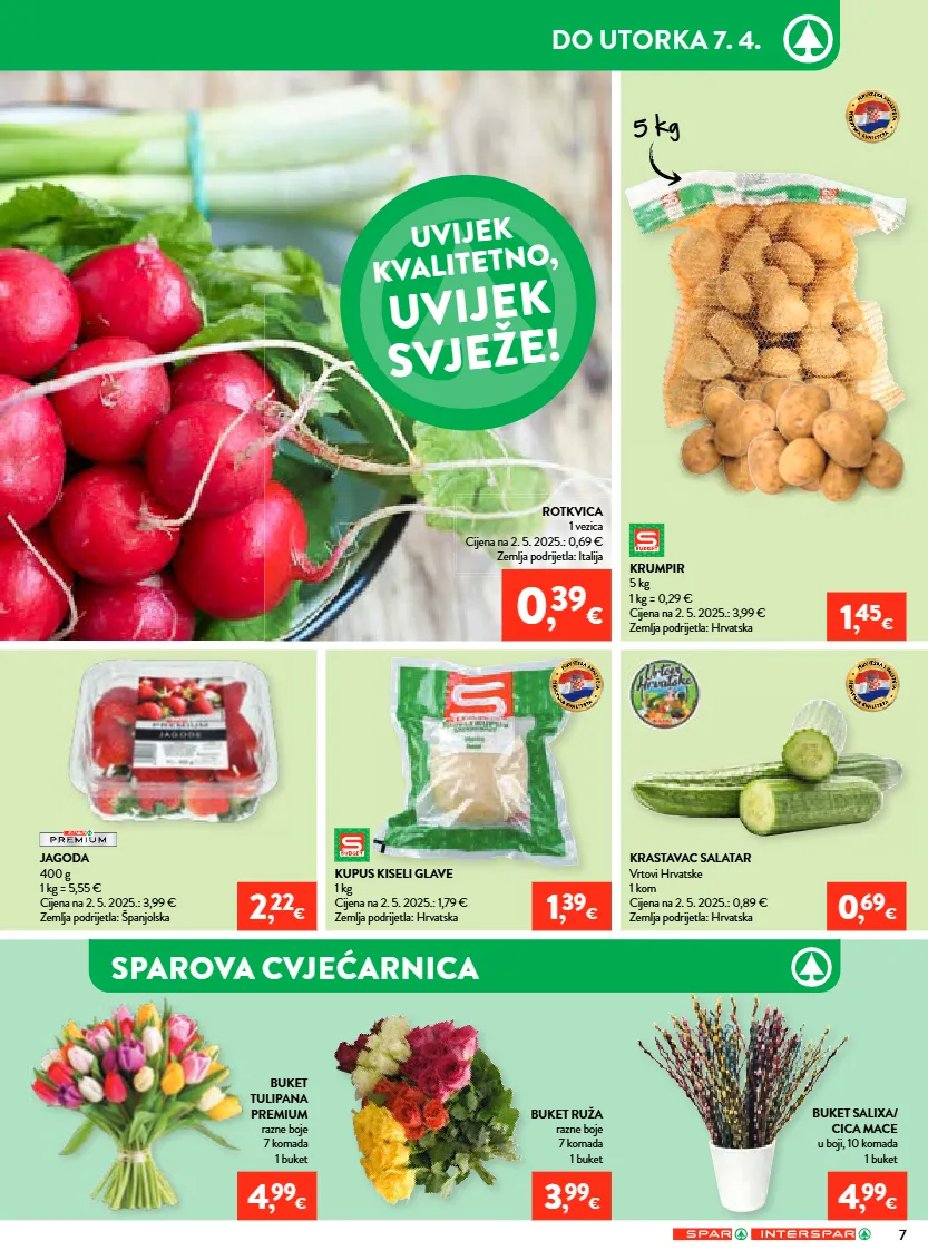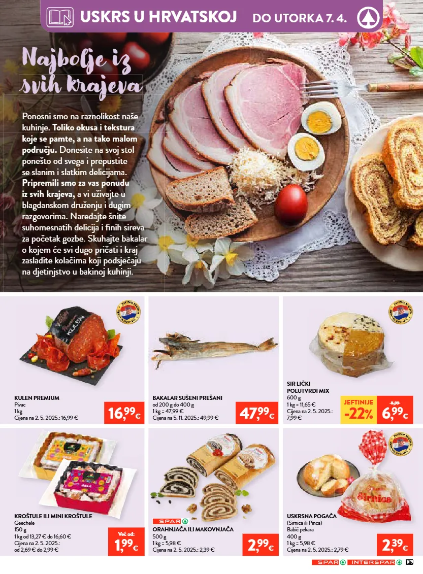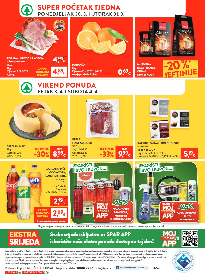 važenje letka je od 1. 4. 2026. do 7. 4. 2026. ili do prodaje zaliha za prehrambene namirnice, kozmetiku, proizvode za osobnu higijenu i sredstva za čišćenje, te od 1. 4. 2026. do 14. 4. 2026. ili do prodaje zaliha za kućanstvo, tekstil, tehniku, sport, hobi program, cvijeće, školu i ured. ponuda ne vrijedi u spar jurišićeva 2a, zagreb. zbog ograničenosti prostora svi proizvodi iz neprehrambenog asortimana nisu dostupni u interspar hipermarketima u samoboru, puli, zadru, ante starčevića 5a i osijek - portanova. zbog ograničenosti prostora svi proizvodi nisu dostupni u svim spar supermarketima. proizvode iz ovog letka moguće je kupiti samo u količinama za kućanstvo. ne odgovaramo za moguće tiskarske greške! izraženi postotak sniženja je minimalan. sve cijene izražene su u eurima s pdv-om. poštovani kupci! pritužbe i pohvale besplatni telefon 0800 7727 – info@spar.hr 14/26 *cijene na polici umanjene su za navedeni postotak. slika je simbolična. popust se ne odnosi na već snižene i promotivne artikle. *cijene na polici umanjene su za navedeni postotak. slika je simbolična. popust se ne odnosi na već snižene i promotivne artikle. vikend ponuda petak 3. 4. i subota 4. 4. super početak tjedna ponedjeljak 30. 3. i utorak 31. 3. svake srijede isključivo uz spar app iskoristite našu ekstra ponudu dostupnu taj dan! ekstra srijeda mljevena kava franck crema od 9 g do 400 g 20% * jeftinije rolana lopatica s kožom vakuum pakiranje pivac 1 kg cijena na 2. 5. 2025.: 4,99 € 4 , 99 € 4 , 89 € za vas dodatno sniženo 2 , 19 € 2 , 09 € za vas dodatno sniženo iskoristi svoj kupon... iskoristi svoj kupon... *cijene na polici umanjene su za navedeni postotak. slika je simbolična. popust se ne odnosi na već snižene i promotivne artikle. samo uz -25% nadgrobni lampioni, mirisne i obične svijeće *cijene na polici umanjene su za navedeni postotak. slika je simbolična. popust se ne odnosi na već snižene i promotivne artikle. samo uz -25% auto oprema i auto kozmetika sir planinski 1 kg cijena na 2. 5. 2025.: 11,99 € pršut narezak jomi 500 g 1 kg = 19,98 € cijena na 2. 5. 2025.: 9,99 € jeftinije -30 % 12,99 8 , 99 € jeftinije -33 % 14,99 9 , 99 € kapsule za kavu dolce gusto razne vrste od 66 g do 270 g 1 kg od 19,22 € do 78,64 € cijena na 2. 5. 2025.: od 6,49 € do 6,79 € gazirano piće cocacola, fanta ili sprite razne vrste 2 l 1 l = 1,10 € cijena na 2. 5. 2025.: 2,29 € u cijenu uključena povratna naknada 5 , 19 € naranča 1 kg cijena na 2. 5. 2025.: 1,49 € zemlja podrijetla: egipat 0 , 69 €