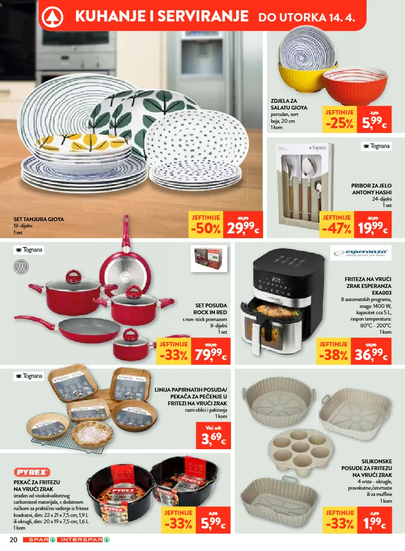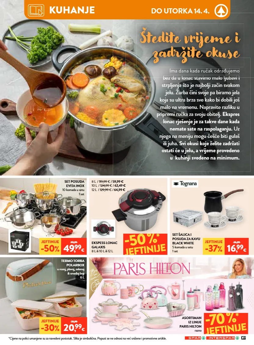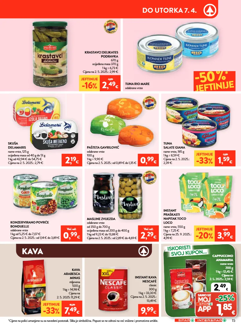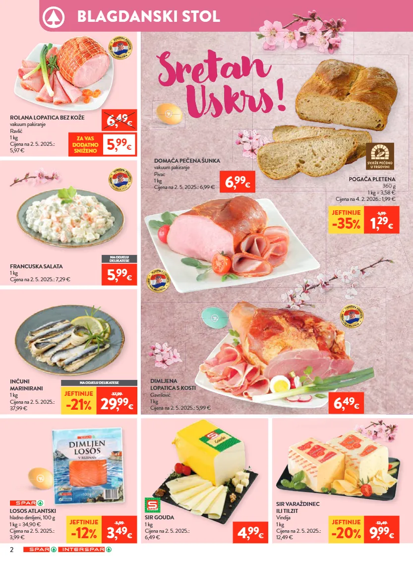 važenje letka je od 1. 4. 2026. do 7. 4. 2026. ili do prodaje zaliha za prehrambene namirnice, kozmetiku, proizvode za osobnu higijenu i sredstva za čišćenje, te od 1. 4. 2026. do 14. 4. 2026. ili do prodaje zaliha za kućanstvo, tekstil, tehniku, sport, hobi program, cvijeće, školu i ured. ponuda ne vrijedi u spar jurišićeva 2a, zagreb. zbog ograničenosti prostora svi proizvodi iz neprehrambenog asortimana nisu dostupni u interspar hipermarketima u samoboru, puli, zadru, ante starčevića 5a i osijek - portanova. zbog ograničenosti prostora svi proizvodi nisu dostupni u svim spar supermarketima. proizvode iz ovog letka moguće je kupiti samo u količinama za kućanstvo. ne odgovaramo za moguće tiskarske greške! izraženi postotak sniženja je minimalan. sve cijene izražene su u eurima s pdv-om. poštovani kupci! pritužbe i pohvale besplatni telefon 0800 7727 – info@spar.hr 14/26 *cijene na polici umanjene su za navedeni postotak. slika je simbolična. popust se ne odnosi na već snižene i promotivne artikle. *cijene na polici umanjene su za navedeni postotak. slika je simbolična. popust se ne odnosi na već snižene i promotivne artikle. vikend ponuda petak 3. 4. i subota 4. 4. super početak tjedna ponedjeljak 30. 3. i utorak 31. 3. svake srijede isključivo uz spar app iskoristite našu ekstra ponudu dostupnu taj dan! ekstra srijeda mljevena kava franck crema od 9 g do 400 g 20% * jeftinije rolana lopatica s kožom vakuum pakiranje pivac 1 kg cijena na 2. 5. 2025.: 4,99 € 4 , 99 € 4 , 89 € za vas dodatno sniženo 2 , 19 € 2 , 09 € za vas dodatno sniženo iskoristi svoj kupon... iskoristi svoj kupon... *cijene na polici umanjene su za navedeni postotak. slika je simbolična. popust se ne odnosi na već snižene i promotivne artikle. samo uz -25% nadgrobni lampioni, mirisne i obične svijeće *cijene na polici umanjene su za navedeni postotak. slika je simbolična. popust se ne odnosi na već snižene i promotivne artikle. samo uz -25% auto oprema i auto kozmetika sir planinski 1 kg cijena na 2. 5. 2025.: 11,99 € pršut narezak jomi 500 g 1 kg = 19,98 € cijena na 2. 5. 2025.: 9,99 € jeftinije -30 % 12,99 8 , 99 € jeftinije -33 % 14,99 9 , 99 € kapsule za kavu dolce gusto razne vrste od 66 g do 270 g 1 kg od 19,22 € do 78,64 € cijena na 2. 5. 2025.: od 6,49 € do 6,79 € gazirano piće cocacola, fanta ili sprite razne vrste 2 l 1 l = 1,10 € cijena na 2. 5. 2025.: 2,29 € u cijenu uključena povratna naknada 5 , 19 € naranča 1 kg cijena na 2. 5. 2025.: 1,49 € zemlja podrijetla: egipat 0 , 69 €