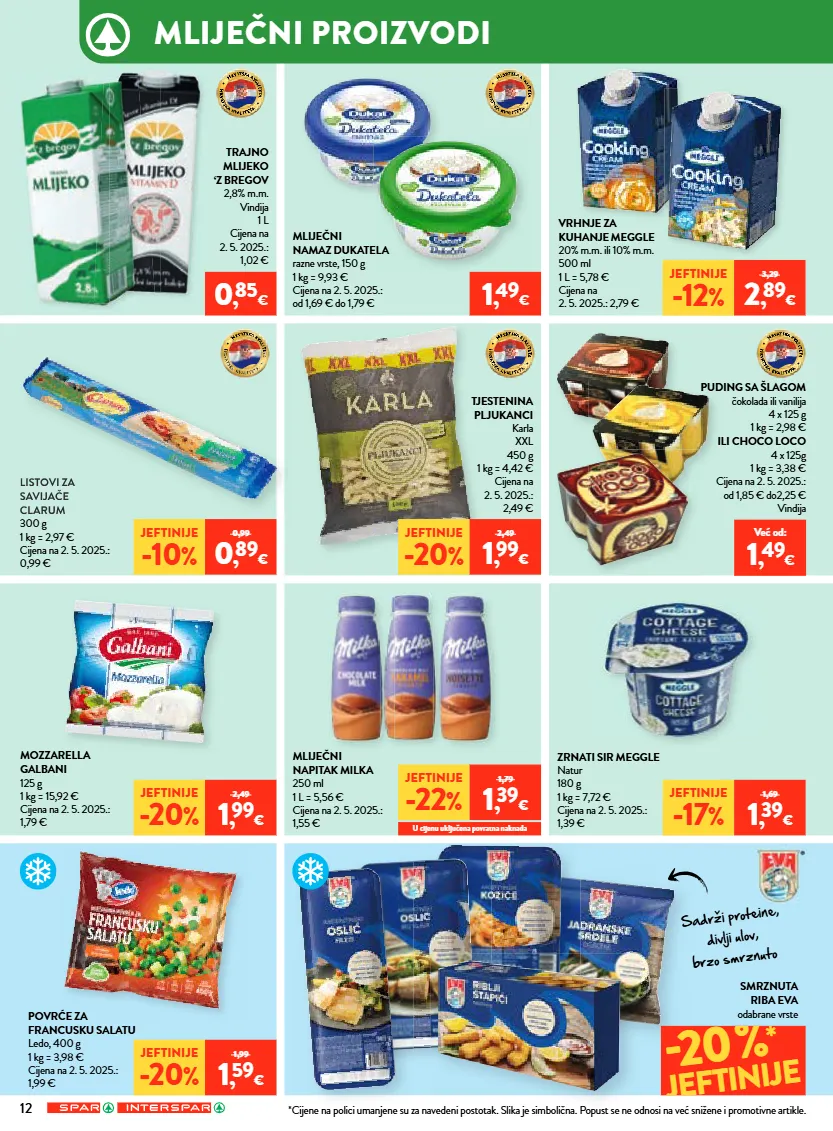 12 sadrži proteine, divlji ulov, brzo smrznuto jeftinije -22 % 1,79 1 , 39 € u cijenu uključena povratna naknada mliječni proizvodi trajno mlijeko ‘z bregov 2,8% m.m. vindija 1 l cijena na 2. 5. 2025.: 1,02 € mliječni namaz dukatela razne vrste, 150 g 1 kg = 9,93 € cijena na 2. 5. 2025.: od 1,69 € do 1,79 € tjestenina pljukanci karla xxl 450 g 1 kg = 4,42 € cijena na 2. 5. 2025.: 2,49 € puding sa šlagom čokolada ili vanilija 4 x 125 g 1 kg = 2,98 € ili choco loco 4 x 125g 1 kg = 3,38 € cijena na 2. 5. 2025.: od 1,85 € do2,25 € vindija mozzarella galbani 125 g 1 kg = 15,92 € cijena na 2. 5. 2025.: 1,79 € mliječni napitak milka 250 ml 1 l = 5,56 € cijena na 2. 5. 2025.: 1,55 € povrće za francusku salatu ledo, 400 g 1 kg = 3,98 € cijena na 2. 5. 2025.: 1,99 € smrznuta riba eva odabrane vrste zrnati sir meggle natur 180 g 1 kg = 7,72 € cijena na 2. 5. 2025.: 1,39 € vrhnje za kuhanje meggle 20% m.m. ili 10% m.m. 500 ml 1 l = 5,78 € cijena na 2. 5. 2025.: 2,79 € 0 , 85 € 1 , 49 € jeftinije -20 % 1,99 1 , 59 € jeftinije -17 % 1,69 1 , 39 € 20% * jeftinije već od: 1 , 49 € *cijene na polici umanjene su za navedeni postotak. slika je simbolična. popust se ne odnosi na već snižene i promotivne artikle. listovi za savijače clarum 300 g 1 kg = 2,97 € cijena na 2. 5. 2025.: 0,99 € listovi za savijače clarum jeftinije -10 % 0,99 0 , 89 € jeftinije -20 % 2,49 1 , 99 € jeftinije -20 % 2,49 1 , 99 € jeftinije -12 % 3,29 2 , 89 € sadrži proteine,