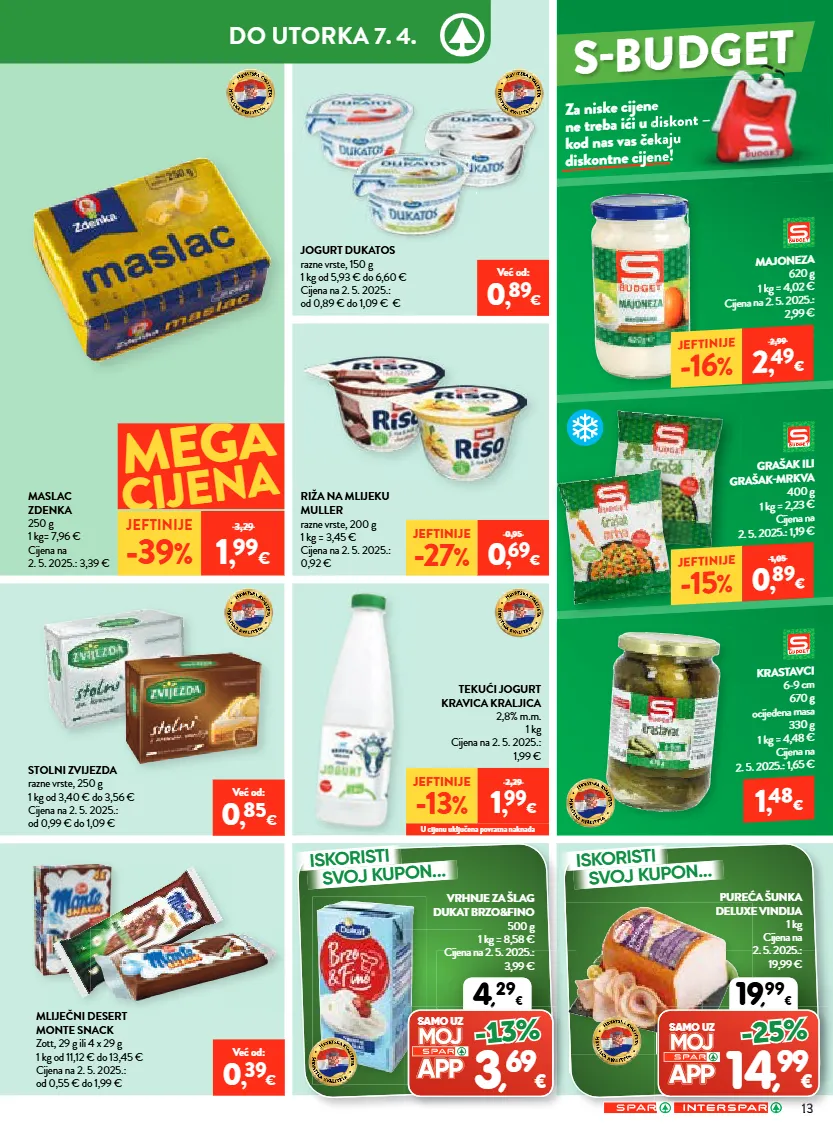 13 do utorka 7. 4. za niske cijene ne treba ići u diskont – kod nas vas čekaju diskontne cijene! krastavci 6-9 cm 670 g ocijeđena masa 330 g 1 kg = 4,48 € cijena na 2. 5. 2025.: 1,65 € 1 , 48 € majoneza 620 g 1 kg = 4,02 € cijena na 2. 5. 2025.: 2,99 € grašak ili grašakmrkva 400 g 1 kg = 2,23 € cijena na 2. 5. 2025.: 1,19 € iskoristi svoj kupon... 4 , 29 € , samo uz 3 , 69 € -13% iskoristi svoj kupon... 19 , 99 € 13 , samo uz 14 , 99 € -25% vrhnje za šlag dukat brzo&fino 500 g 1 kg = 8,58 € cijena na 2. 5. 2025.: 3,99 € pureća šunka deluxe vindija 1 kg cijena na 2. 5. 2025.: 19,99 € maslac zdenka 250 g 1 kg= 7,96 € cijena na 2. 5. 2025.: 3,39 € jogurt dukatos razne vrste, 150 g 1 kg od 5,93 € do 6,60 € cijena na 2. 5. 2025.: od 0,89 € do 1,09 € € stolni zvijezda razne vrste, 250 g 1 kg od 3,40 € do 3,56 € cijena na 2. 5. 2025.: od 0,99 € do 1,09 € riža na mlijeku muller razne vrste, 200 g 1 kg = 3,45 € cijena na 2. 5. 2025.: 0,92 € mliječni desert monte snack zott, 29 g ili 4 x 29 g 1 kg od 11,12 € do 13,45 € cijena na 2. 5. 2025.: od 0,55 € do 1,99 € tekući jogurt kravica kraljica 2,8% m.m. 1 kg cijena na 2. 5. 2025.: 1,99 € jeftinije -27 % 0,95 0 , 69 € jeftinije -15 % 1,05 0 , 89 € jeftinije -16 % 2,99 2 , 49 € jeftinije -13 % 2,29 1 , 99 € u cijenu uključena povratna naknada već od: 0 , 39 € već od: 0 , 85 € mega cijena jeftinije -39 % 3,29 1 , 99 € već od: 0 , 89 € sbudget sbudget za niske cijene ne treba ići u diskont – kod nas vas čekaju diskontne cijene! diskontne cijene! sbudget