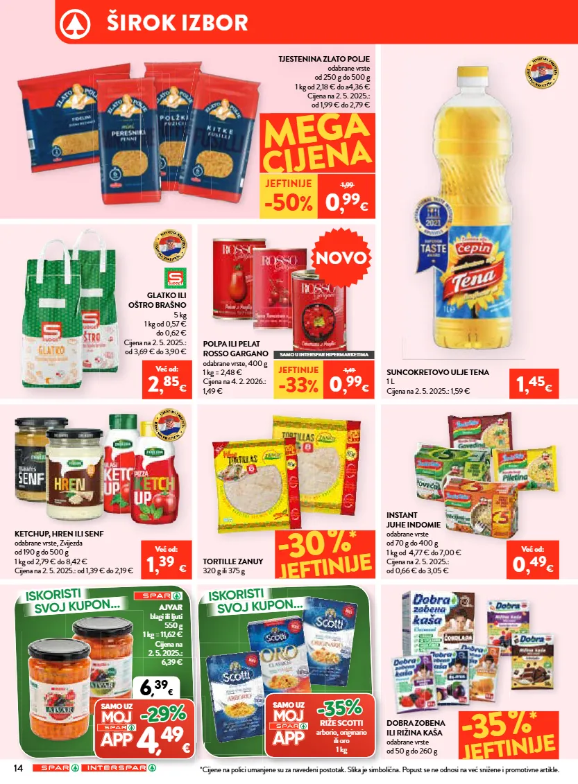 14 širok izbor 6 , 39 € , samo uz 4 , 49 € -29% 30% * jeftinije 1 , 45 € već od: 1 , 39 € već od: 0 , 49 € već od: 2 , 85 € mega cijena jeftinije -50 % 1,99 0 , 99 € mega tjestenina zlato polje odabrane vrste od 250 g do 500 g 1 kg od 2,18 € do a4,36 € cijena na 2. 5. 2025.: od 1,99 € do 2,79 € tortille zanuy 320 g ili 375 g 35% * jeftinije dobra zobena ili rižina kaša odabrane vrste od 50 g do 260 g glatko ili oštro brašno 5 kg 1 kg od 0,57 € do 0,62 € cijena na 2. 5. 2025.: od 3,69 € do 3,90 € suncokretovo ulje tena 1 l cijena na 2. 5. 2025.: 1,59 € instant juhe indomie odabrane vrste od 70 g do 400 g 1 kg od 4,77 € do 7,00 € cijena na 2. 5. 2025.: od 0,66 € do 3,05 € ketchup, hren ili senf odabrane vrste, zvijezda od 190 g do 500 g 1 kg od 2,79 € do 8,42 € cijena na 2. 5. 2025.: od 1,39 € do 2,19 € ajvar blagi ili ljuti 550 g 1 kg = 11,62 € cijena na 2. 5. 2025.: 6,39 € samo uz -35% riže scotti arborio, originario ili oro 1 kg polpa ili pelat rosso gargano odabrane vrste, 400 g 1 kg = 2,48 € cijena na 4. 2. 2026.: 1,49 € jeftinije -33 % 1,49 0 , 99 € samo u interspar hipermarketima novo iskoristi svoj kupon... iskoristi svoj kupon... *cijene na polici umanjene su za navedeni postotak. slika je simbolična. popust se ne odnosi na već snižene i promotivne artikle.