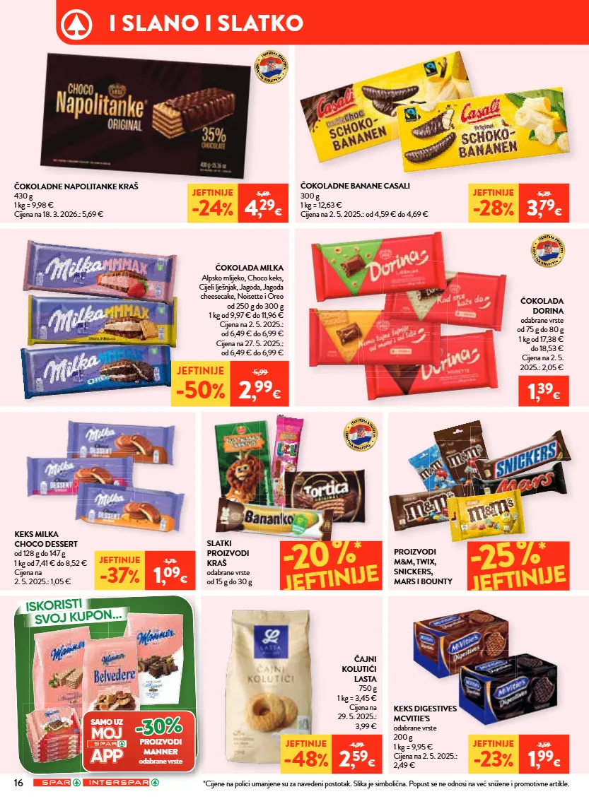 16 i slano i slatko iskoristi svoj kupon... čokolada milka alpsko mlijeko, choco keks, cijeli lješnjak, jagoda, jagoda cheesecake, noisette i oreo od 250 g do 300 g 1 kg od 9,97 € do 11,96 € cijena na 2. 5. 2025.: od 6,49 € do 6,99 € cijena na 27. 5. 2025.: od 6,49 € do 6,99 € keks milka choco dessert od 128 g do 147 g 1 kg od 7,41 € do 8,52 € cijena na 2. 5. 2025.: 1,05 € čokolada dorina odabrane vrste od 75 g do 80 g 1 kg od 17,38 € do 18,53 € cijena na 2. 5. 2025.: 2,05 € čokoladne banane casali 300 g 1 kg = 12,63 € cijena na 2. 5. 2025.: od 4,59 € do 4,69 € čokoladne napolitanke kraš 430 g 1 kg = 9,98 € cijena na 18. 3. 2026.: 5,69 € keks digestives mcvitie’s odabrane vrste 200 g 1 kg = 9,95 € cijena na 2. 5. 2025.: 2,49 € slatki proizvodi kraš odabrane vrste od 15 g do 30 g čajni kolutići lasta 750 g 1 kg = 3,45 € cijena na 29. 5. 2025.: 3,99 € proizvodi m&m, twix, snickers, mars i bounty samo uz -30% proizvodi manner odabrane vrste jeftinije -50 % 5,99 2 , 99 € jeftinije -37 % 1,75 1 , 09 € jeftinije -28 % 5,29 3 , 79 € jeftinije -48 % 4,99 2 , 59 € jeftinije -23 % 2,59 1 , 99 € jeftinije -24 % 5,69 4 , 29 € 20% * jeftinije 25% * jeftinije *cijene na polici umanjene su za navedeni postotak. slika je simbolična. popust se ne odnosi na već snižene i promotivne artikle. 1 , 39 €