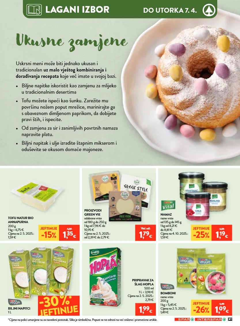 *cijene na polici umanjene su za navedeni postotak. slika je simbolična. popust se ne odnosi na već snižene i promotivne artikle. do utorka 7. 4. lagani izbor proizvodi green vie odabrane vrste od 180 g do 250 g 1 kg od 7,96 € do 10,95 € cijena na 2. 5. 2025.: od 2,39 € do 2,79 € pripravak za šlag hopla 500 ml 1 l = 3,98 € cijena na 2. 5. 2025.: 2,79 € namaz razne vrste od 135 g do 145 g 1 kg od 8,21 € do 8,81 € cijena na 4. 10. 2025.: 1,59 € bomboni razne vrste 200 g 1 kg = 5,45 € cijena na 2. 5. 2025.: 1,49 € jeftinije -25 % 1,59 1 , 19 € jeftinije -26 % 1,49 1 , 09 € uskrsni meni može biti jednako ukusan i tradicionalan uz malo vještog kombiniranja i dorađivanja recepata koje već imate u svojoj bazi. • biljne napitke iskoristit kao zamjenu za mlijeko u tradicionalnim desertima • tofu možete ispeći kao šunku. zarežite mu površinu nožem poput mrežice, marinirajte ga s obaveznom dimljenom paprikom, da dobijete pravi štih, i ispecite. • od zamjena za sir i zanimljivih povrtnih namaza napravite platu. • biljni napitak i ulje izradite štapnim mikserom i oduševite se okusom domaće majoneze. tofu natur bio annapurna 200 g 1 kg = 6,75 € cijena na 2. 5. 2025.: 1,59 € biljni napitci 1 l jeftinije -15 % 1,59 1 , 35 € 30% * jeftinije 1 , 99 € ukne zamjene već od: 1 , 79 €