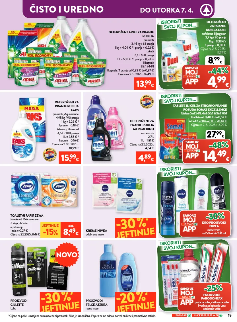 čisto i uredno do utorka 7. 4. deterdžent za pranje rublja meri merino razne vrste 2,7 l 1 l = 1,81 € cijena na 2.5.2025.: 4,64 € deterdžent ariel za pranje rublja praškasti 3,46 kg / 63 pranja 1 kg = 4,04 € / 1 pranje = 0,22 € tekući 2,7 l / 60 pranja 1 l = 5,18 € / 1 pranje = 0,23 € ili kapsule 38/1 i 44/1 1 kapsula / 1 pranje od 0,32 € do 0,37 € cijena na 2. 5. 2025.: 16,49 € toaletni papir zewa breskva ili delicate care 3 sloja, 32 role u pakiranju 1 rola = 0,27 € cijena na 2.5.2025.: 8,49 € kreme nivea odabrane vrste proizvodi felce azzura razne vrste proizvodi gillette labs deterdžent za pranje rublja faks praškasti, aquamarine 4,95 kg / 90 pranja 1 kg = 3,23 € / 1 pranje = 0,18 € ili tekući, universal 4,5 l / 100 pranja 1 l = 3,55 € / 1 pranje = 0,16 € cijena na 2. 10. 2025.: 18,99 € deterdžent za pranje rublja duel soft lotus ili jorgovan 2,7 kg / 30 pranja 1 kg = 3,33 € / 1 pranje = 0,30 € cijena na 2. 5. 2025.: 4,99 € 30% * jeftinije 20% * jeftinije 30% * jeftinije iskoristi svoj kupon... iskoristi svoj kupon... iskoristi svoj kupon... cijena na 2. 5. 2025.: cijena na 2. 5. 2025.: 4,99 € 8 , 99 € , samo uz 4 , 99 € -44% jeftinije -15 % 9,99 8 , 49 € iskoristi iskoristi iskoristi samo uz -30% deo proizvodi nivea razne vrste, od 50 ml do 150 ml samo uz -25% proizvodi parodontax pasta za zube, četkice za zube i vodica za ispiranje usta odabrane vrste *cijene na polici umanjene su za navedeni postotak. slika je simbolična. popust se ne odnosi na već snižene i promotivne artikle. 15 , 99 € 4 , 89 € tablete ili gel za strojno pranje posuđa somat excellence tablete 5in1 54/1, 4in1 60/1 ili 3in1 70/1 1 tableta od 0,40 € do 0,52 € ili gel 2 x 684 ml, 1 l = 20,47 € cijena na 2. 5. 2025.: 13,99 € ili gel 2 x 684 ml, 1 l = 20,47 € cijena na 2. 5. 2025.: 13,99 € 27 , 99 € , samo uz 14 , 49 € -48% iskoristi svoj kupon... novo 19 13 , 99 €
