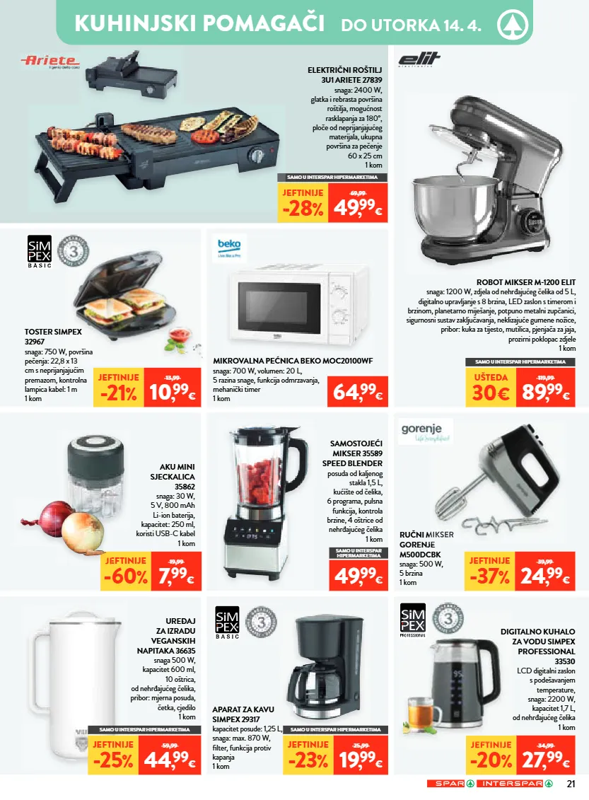 kuhinjski pomagači do utorka 14. 4. ručni mikser gorenje m500dcbk snaga: 500 w, 5 brzina 1 kom 64 , 99 € 49 , 99 € samo u interspar hipermarketima jeftinije -20 % 34,99 27 , 99 € jeftinije -21 % 13,99 10 , 99 € jeftinije -37 % 39,99 24 , 99 € ušteda 30 € 119,99 89 , 99 € jeftinije -28 % 69,99 49 , 99 € samo u interspar hipermarketima samo u interspar hipermarketima jeftinije -60 % 19,99 7 , 99 € jeftinije jeftinije jeftinije -28 ručni mikser gorenje ručni mikser jeftinije jeftinije -23 % 25,99 19 , 99 € samo u interspar hipermarketima samo u interspar hipermarketima robot mikser m1200 elit snaga: 1200 w, zdjela od nehrđajućeg čelika od 5 l, digitalno upravljanje s 8 brzina, led zaslon s timerom i brzinom, planetarno miješanje, potpuno metalni zupčanici, sigurnosni sustav zaključavanja, neklizajuće gumene nožice, pribor: kuka za tijesto, mutilica, pjenjača za jaja, prozirni poklopac zdjele 1 kom digitalno kuhalo za vodu simpex professional 33530 lcd digitalni zaslon s podešavanjem temperature, snaga: 2200 w, kapacitet 1,7 l, od nehrđajućeg čelika 1 kom mikrovalna pećnica beko moc20100wf snaga: 700 w, volumen: 20 l, 5 razina snage, funkcija odmrzavanja, mehanički timer 1 kom uređaj za izradu veganskih napitaka 36635 snaga 500 w, kapacitet 600 ml, 10 oštrica, od nehrđajućeg čelika, pribor: mjerna posuda, četka, cjedilo 1 kom električni roštilj 3u1 ariete 27839 snaga: 2400 w, glatka i rebrasta površina roštilja, mogućnost rasklapanja za 180°, ploče od neprijanjajućeg materijala, ukupna površina za pečenje 60 x 25 cm 1 kom aparat za kavu simpex 29317 kapacitet posude: 1,25 l, snaga: max. 870 w, filter, funkcija protiv kapanja 1 kom samostojeći mikser 35589 speed blender posuda od kaljenog stakla 1,5 l, kućište od čelika, 6 programa, pulsna funkcija, kontrola brzine, 4 oštrice od nehrđajućeg čelika 1 kom toster simpex 32967 snaga: 750 w, površina pečenja: 22,8 x 13 cm s neprijanjajućim premazom, kontrolna lampica kabel: 1 m 1 kom aku mini sjeckalica 35862 snaga: 30 w, 5 v, 800 mah li-ion baterija, kapacitet: 250 ml, koristi usb-c kabel 1 kom jeftinije -25 % 59,99 44 , 99 € 21