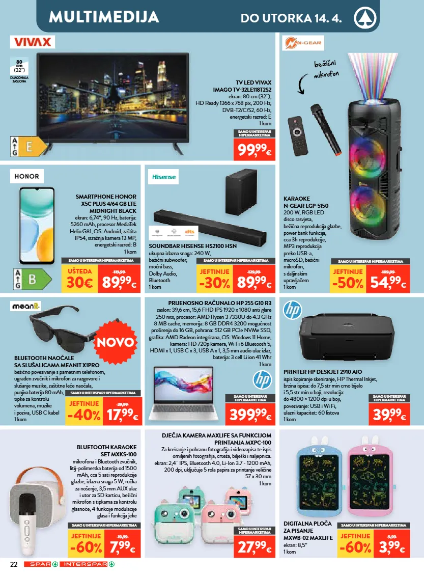 novo multimedija do utorka 14. 4. bluetooth karaoke set mxks100 mikrofona i bluetooth zvučnik, litij-polimerska baterija od 1500 mah, cca 5 sati reprodukcije glazbe, izlazna snaga 5 w, ručka za nošenje, 3,5 mm aux ulaz i utor za sd karticu, bežični mikrofon s tipkama za kontrolu glasnoće, 4 funkcije modulacije glasa i funkcija jeke printer hp deskjet 2910 aio ispis kopiranje skeniranje, hp thermal inkjet, brzina ispisa: do 7,5 str min crno bijelo i 5,5 str min u boji, rezolucija: do 4800 × 1200 dpi u boji, povezivanje: usb i wi fi, ulazni kapacitet: 60 listova 1 kom prijenosno računalo hp 255 g10 r3 zaslon: 39,6 cm, 15,6 fhd ips 1920 x 1080 anti glare 250 nits, procesor: amd ryzen 3 7330u do 4.3 ghz 8 mb cache, memorija: 8 gb ddr4 3200 mogućnost proširenja do 16 gb, pohrana: 512 gb pcie nvme ssd, grafika: amd radeon integrirana, os: windows 11 home, kamera: hd 720p kamera, wi fi 6 bluetooth 5, hdmi x 1, usb c x 3, usb a x 1, 3,5 mm audio ulaz izlaz, baterija: 3 cell li ion 41 whr 1 kom tv led vivax imago tv32le118t2s2 ekran: 80 cm (32¨), hd ready 1366 x 768 pix, 200 hz, dvb-t2/c/s2, 60 hz, energetski razred: e 1 kom smartphone honor x5c plus 4/64 gb lte midnight black ekran: 6,74“, 90 hz, baterija: 5260 mah, procesor mediatek helio g81, os: android, zaštita ip54, stražnja kamera 13 mp, energetski razred: b 1 kom dječja kamera maxlife sa funkcijom printanja mxpc100 za kreiranje i pohranu fotografija i videozapisa te ispis omiljenih fotografija, crteža, bilješki i naljepnica. ekran: 2,4¨ ips, bluetooth 4.0, li-ion 3.7 - 1200 mah, 200 dpi, uključuje 5 rola papira za printanje veličine 57 x 30 mm 1 kom soundbar hisense hs2100 hsn ukupna izlazna snaga: 240 w, bežični subwoofer, moćni bass, dolby audio, bluetooth 1 kom karaoke ngear lgp5150 200 w, rgb led disco rasvjeta, bežična reprodukcija glazbe, power bank funkcija, cca 3h reprodukcije, mp3 reprodukcija preko usb-a, microsd, bežični mikrofon, s daljinskim upravljačem 1 kom digitalna ploča za pisanje mxwb02 maxlife ekran: 8,5” 1 kom bluetooth naočale sa slušalicama meanit x1pro bežično povezivanje s pametnim telefonom, ugrađen zvučnik i mikrofon za razgovore i slušanje muzike, zaštitne leće naočala, punjiva baterija 80 mah, tipke za kontrolu volumena, muzike i poziva, usb c kabel 1 kom 399 , 99 € 80 cm (32”) dijagonala zaslona samo u interspar hipermarketima 39 , 99 € samo u interspar hipermarketima 99 , 99 € samo u interspar hipermarketima jeftinije -30 % 129,99 89 , 99 € jeftinije -40 % 29,99 17 , 99 € samo u interspar hipermarketima jeftinije -50 % 109,99 54 , 99 € samo u interspar hipermarketima samo u interspar hipermarketima jeftinije -60 % 19,99 7 , 99 € samo u interspar hipermarketima jeftinije -60 % 9,99 3 , 99 € samo u interspar hipermarketima ušteda 30 € 119,99 89 , 99 € samo u interspar hipermarketima samo u interspar hipermarketima 27 , 99 € bežični mikrofon 22