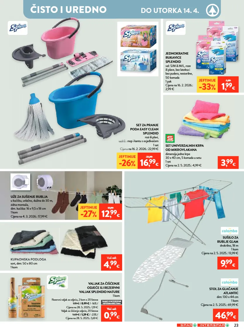 čisto i uredno do utorka 14. 4. valjak za čišćenje odjeće ili rezervni valjak splendid nature 1 kom kupaonska podloga sort, dim: 50 x 80 cm 1 kom sušilo za rublje glam dvokrilno, 18 m 1 kom cijena na 2. 5. 2025.: 13,99 € stol za glačanje atlantic dim: 130 x 44 cm 1 kom cijena na 2. 5. 2025.: 69,99 € set univerzalnih krpa od mikrovlakana dimenzija jedne krpe 30 x 40 cm, 5 komada u setu 1 set cijena na 2. 5. 2025.: 4,99 € jednokratne rukavice splendid vel: s/m ili m/l, roze ili plave, bez lateksa i bez pudera, nesterilne, 50 komada 1 pak cijena na 16. 2. 2026.: 2,99 € set za pranje poda easy clean splendid rozi ili plavi, sadrži: mop i kantu s ocjeđivačem 1 set cijena na 16. 2. 2026.: 22,99 € uže za sušenje rublja u kućištu, uvlačno, dužina do 30 m, zidna montaža, dim. kućišta: 16 x 9,5 x 18 cm 1 kom cijena na 4. 3. 2026.: 17,99 € rezervni valjak za odjeću, 2 kom x 20 listova 1.19 € / 0.99 € / -16% / cijena na 28. 5. 2025.: 1,19 € valjak za čišćenje odjeće, 20 listova 1.69 € / 1.29 € / -23% / cijena na 28. 5. 2025.: 1,69 € već od: 4 , 99 € jeftinije -33 % 2,99 1 , 99 € jeftinije -27 % 17,99 12 , 99 € jeftinije -26 % 22,99 16 , 99 € već od: 0 , 99 € samo u interspar hipermarketima 46 , 99 € 9 , 99 € kupaonska podloga sort, dim: 50 x 80 cm već od: 4 već od: sadrži: mop i kantu s ocjeđivačem cijena na 16. 2. 2026.: 22,99 € jeftinije -26 3 , 99 € 23