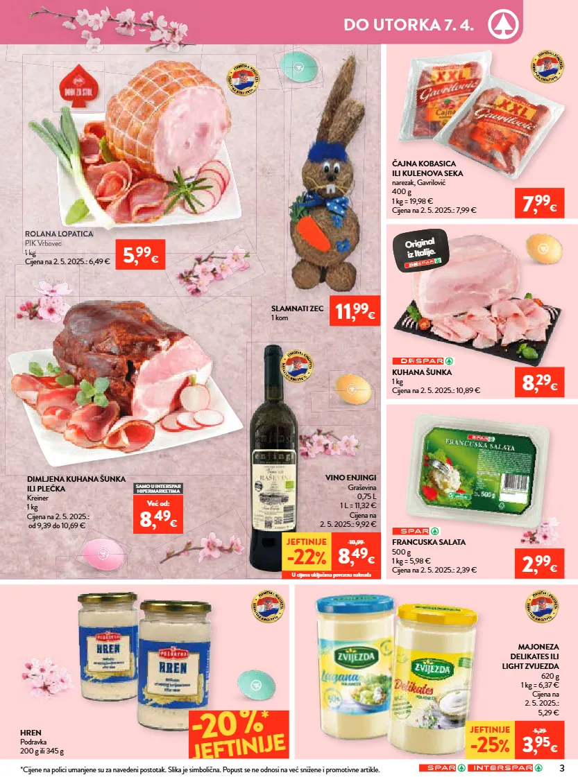 3 original iz italije. 20% * jeftinije 5 , 99 € 11 , 99 € 7 , 99 € 8 , 29 € 2 , 99 € jeftinije -25 % 5,29 3 , 95 € čajna kobasica ili kulenova seka narezak, gavrilović 400 g 1 kg = 19,98 € cijena na 2. 5. 2025.: 7,99 € dimljena kuhana šunka ili plećka kreiner 1 kg cijena na 2. 5. 2025.: od 9,39 do 10,69 € kuhana šunka 1 kg cijena na 2. 5. 2025.: 10,89 € slamnati zec 1 kom vino enjingi graševina 0,75 l 1 l = 11,32 € cijena na 2. 5. 2025.: 9,92 € rolana lopatica pik vrbovec 1 kg cijena na 2. 5. 2025.: 6,49 € francuska salata 500 g 1 kg = 5,98 € cijena na 2. 5. 2025.: 2,39 € majoneza delikates ili light zvijezda 620 g 1 kg = 6,37 € cijena na 2. 5. 2025.: 5,29 € hren podravka 200 g ili 345 g jeftinije -22 % 10,99 8 , 49 € u cijenu uključena povratna naknada samo u interspar hipermarketima već od: 8 , 49 € *cijene na polici umanjene su za navedeni postotak. slika je simbolična. popust se ne odnosi na već snižene i promotivne artikle. do utorka 7. 4. 99 11 99 slamnati zec do utorka 7. 4. 11 99 5 99 rolana lopatica pik vrbovec 1 kg