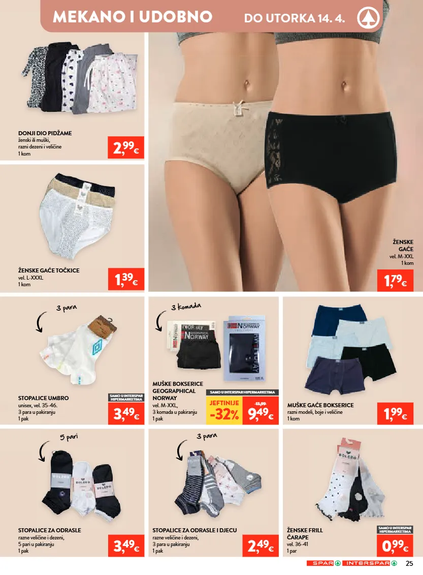 samo u interspar hipermarketima mekano i udobno do utorka 14. 4. ženske frill čarape vel. 36-41 1 par donji dio pidžame ženski ili muški, razni dezeni i veličine 1 kom stopalice za odrasle razne veličine i dezeni, 5 pari u pakiranju 1 pak stopalice umbro unisex, vel. 35-46. 3 para u pakiranju 1 pak muške gaće bokserice razni modeli, boje i veličine 1 kom stopalice za odrasle i djecu razne veličine i dezeni, 3 para u pakiranju 1 pak ženske gaće vel. m-xxl 1 kom ženske gaće točkice vel. l-xxxl 1 kom muške bokserice geographical norway vel. m-xxl, 3 komada u pakiranju 1 pak 0 , 99 € 3 , 49 € 2 , 99 € 1 , 79 € 3 , 49 € 1 , 99 € 1 , 39 € 2 , 49 € 3 komada 5 pari 3 para 3 para 25 jeftinije -32 % 13,99 9 , 49 € samo u interspar hipermarketima samo u interspar hipermarketima
