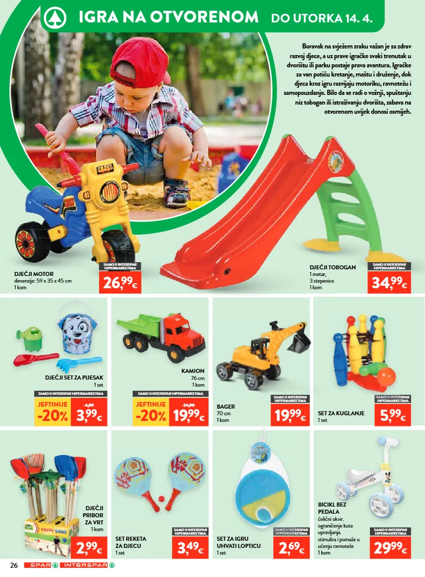 igra na otvorenom do utorka 14. 4. boravak na svježem zraku važan je za zdrav razvoj djece, a uz prave igračke svaki trenutak u dvorištu ili parku postaje prava avantura. igračke za van potiču kretanje, maštu i druženje, dok djeca kroz igru razvijaju motoriku, ravnotežu i samopouzdanje. bilo da se radi o vožnji, spuštanju niz tobogan ili istraživanju dvorišta, zabava na otvorenom uvijek donosi osmijeh. samo u interspar hipermarketima samo u interspar hipermarketima samo u interspar hipermarketima samo u interspar hipermarketima samo u interspar hipermarketima samo u interspar hipermarketima samo u interspar dječji set za pijesak 1 set dječji pribor za vrt 1 kom dječji motor dimenzije: 59 x 35 x 45 cm 1 kom set za kuglanje 1 set kamion 76 cm 1 kom dječji tobogan 1 metar, 3 stepenice 1 kom set za igru uhvati lopticu 1 set set reketa za djecu 1 set bager 70 cm 1 kom bicikl bez pedala čelični okvir. ograničenje kuta upravljanja. stimulira i pomaže u učenju ravnoteže 1 kom samo u interspar hipermarketima jeftinije -20 % 4,99 3 , 99 € jeftinije -20 % 24,99 19 , 99 € 26 , 99 € 5 , 99 € 34 , 99 € 2 , 69 € 2 , 99 € 3 , 49 € 19 , 99 € samo u interspar hipermarketima 29 99 € samo u interspar hipermarketima samo u interspar hipermarketima 26