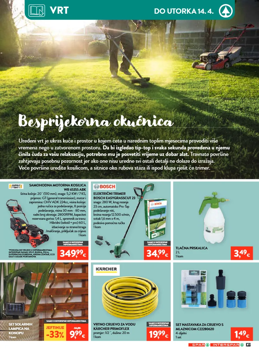 električni trimer bosch easygrasscut 23 snaga: 280 w, krug rezanja 23 cm, automatsko pro-tap podešavanje niti, brzina rezanja 12.500 o/min, svitak 1,6 mm x 4 m, podesiva pomoćna ručka 1 kom samohodna motorna kosilica wr 65355 abk širina košnje: 20¨ (510 mm), snaga: 5,2 kw / 7 ks, prijenos: gt (general transmission), motor i zapremina: ohv adk 224cc, visina košnje: jedna ručica za podešavanje, 8 pozicija podešavanja, visina 30 mm - 80 mm, radni broj okretaja: 2800rpm, kapacitet rezervoara goriva: 1,4 l, spremnik za travu: hibridni (tekstil + pvc) 60 l, izbacivanje sa strane/straga /malčiranje, priključak za crijevo 1 kom *ponuda ne vrijedi u hipermarketima interspar zadar, split, rijeka, pula, supernova dubrava, arena centar, cco east i osijek portanova tlačna prskalica 2 l 1 kom vrtno crijevo za vodu kärcher primoflex promjer: 1/2 ¨, dužina: 20 m 1 kom set solarnih lampica na konopu 1 kom set nastavaka za crijevo s mlaznicom c22280620 4-dijelni 1 set 3 , 49 € bprijekna okućnica samo u interspar hipermarketima jeftinije -33 % 14,99 9 , 99 € samo u interspar hipermarketima 349 , 99 € 34 , 99 € samo u interspar hipermarketima 1 , 49 € 19 , 99 € samo u interspar hipermarketima bprijekna okućnica uređeni vrt je ukras kuće i prostor u kojem ćete u narednim toplim mjesecima provoditi više vremena nego u zatvorenom prostoru. da bi izgledao tip-top i svaka sekunda provedena u njemu činila čuda za vašu relaksaciju, potrebno mu je posvetiti vrijeme uz dobar alat. travnate površine zahtjevaju posebnu pozornost jer ako one nisu uredne svi ostali detalji ne dolaze do izražaja. veće površine uredite kosilicom, a sitnice oko rubova staza ili ispod klupa rješit će trimer. do utorka 14. 4. vrt