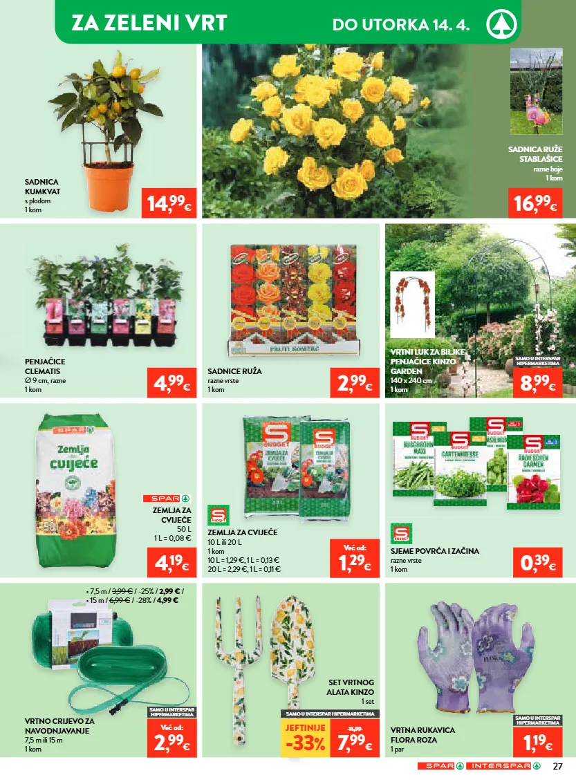samo u interspar hipermarketima za zeleni vrt do utorka 14. 4. sadnice ruža razne vrste 1 kom zemlja za cvijeće 50 l 1 l = 0,08 € zemlja za cvijeće 10 l ili 20 l 1 kom 10 l = 1,29 €, 1 l = 0,13 € 20 l = 2,29 €, 1 l = 0,11 € penjačice clematis ø 9 cm, razne 1 kom set vrtnog alata kinzo 1 set vrtno crijevo za navodnjavanje 7,5 m ili 15 m 1 kom vrtna rukavica flora roza 1 par sadnica kumkvat s plodom 1 kom sjeme povrća i začina razne vrste 1 kom sadnica ruže stablašice razne boje 1 kom vrtni luk za biljke penjačice kinzo garden 140 x 240 cm 1 kom jeftinije -33 % 11,99 7 , 99 € 2 , 99 € 4 , 99 € 4 , 19 € 14 , 99 € 0 , 39 € 16 , 99 € 8 , 99 € samo u interspar hipermarketima 1 , 19 € već od: 1 , 29 € • 7,5 m / 3,99 € / -25% / 2,99 € / • 15 m / 6,99 € / -28% / 4,99 € samo u interspar hipermarketima već od: 2 , 99 € samo u interspar hipermarketima 27