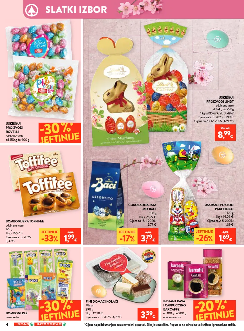 4 3 , 59 € već od: 8 , 99 € 30% * jeftinije 20% * jeftinije 30% * jeftinije jeftinije -26 % 2,29 1 , 69 € jeftinije -33 % 2,99 1 , 99 € jeftinije -17 % 4,59 3 , 79 € čokoladna jaja mix baci 150 g 1 kg = 25,27 € cijena na 15. 1. 2026.: 5,79 € bomboni pez razne vrste instant kava i cappuccino barcaffe od 100 g do 200 g odabrane vrste uskršnji proizvodi rovelli odabrane vrste od 350 g do 400 g uskršnji proizvodi lindt odabrane vrste od 194 g do 252 g 1 kg od 35,67 € do 51,49 € cijena na 2. 5. 2025.: 0,99 € cijena na 23. 12. 2025.: 12,99 € bombonijera toffifee odabrane vrste 125 g 1 kg = 15,92 € cijena na 2. 5. 2025.: 3,39 € fini domaći kolači mlinar 290 g 1 kg = 12,38 € cijena na 2. 5. 2025.: 4,29 € uskršnji poklon paket inco 120 g 1 kg = 14,08 € cijena na 2. 5. 2025.: 1,39 € *cijene na polici umanjene su za navedeni postotak. slika je simbolična. popust se ne odnosi na već snižene i promotivne artikle. slatki izbor