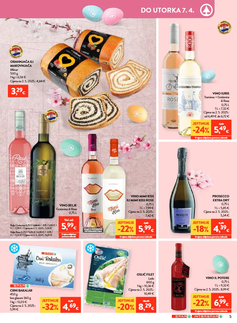 5 samo u interspar hipermarketima 3 , 29 € jeftinije -22 % 8,99 6 , 99 € jeftinije -22 % 7,69 5 , 99 € jeftinije -18 % 5,39 4 , 39 € jeftinije -24 % 7,29 5 , 49 € jeftinije -20 % 10,49 8 , 29 € jeftinije -32 % 6,99 4 , 69 € vino mimi kiss ili mimi kiss rose 0,75 l 1 l = 7,99 € cijena na 2. 5. 2025.: 7,42 € prosecco extra dry 0,75 l 1 l = 5,85 € cijena na 2. 5. 2025.: 5,34 € vino iuris traminac + graševina ili rose 0,75 l 1 l = 7,32 € cijena na 2. 5. 2025.: od 6,49 € do 6,72 € vino il potere 0,75 l 1 l = 9,32 € cijena na 2. 5. 2025.: 8,99 € orahnjača ili makovnjača mlinar 500 g 1 kg = 6,58 € cijena na 2. 5. 2025.: 4,84 € oslić filet ledo 800 g 1 kg = 10,36 € cijena na 2. 5. 2025.: 10,49 € crni bakalar 450 g bez glazure 360 g 1 kg = 13,03 € cijena na 2. 5. 2025.: 5,99 € u cijenu uključena povratna naknada u cijenu uključena povratna naknada u cijenu uključena povratna naknada u cijenu uključena povratna naknada vino belje graševina ili rose 0,75 l belje graševina 0,75 l / 7,05 € / -15% / 5,99 € / 1 l = 7,99 € / cijena na 2. 5. 2025.: 7,05 € belje rose 0,75 l / 9,05 € / 6,99 € / -22% / 1 l = 9,32 € / cijena na 2. 5. 2025.: 9,05 € već od: 5 , 99 € u cijenu uključena povratna naknada do utorka 7. 4.