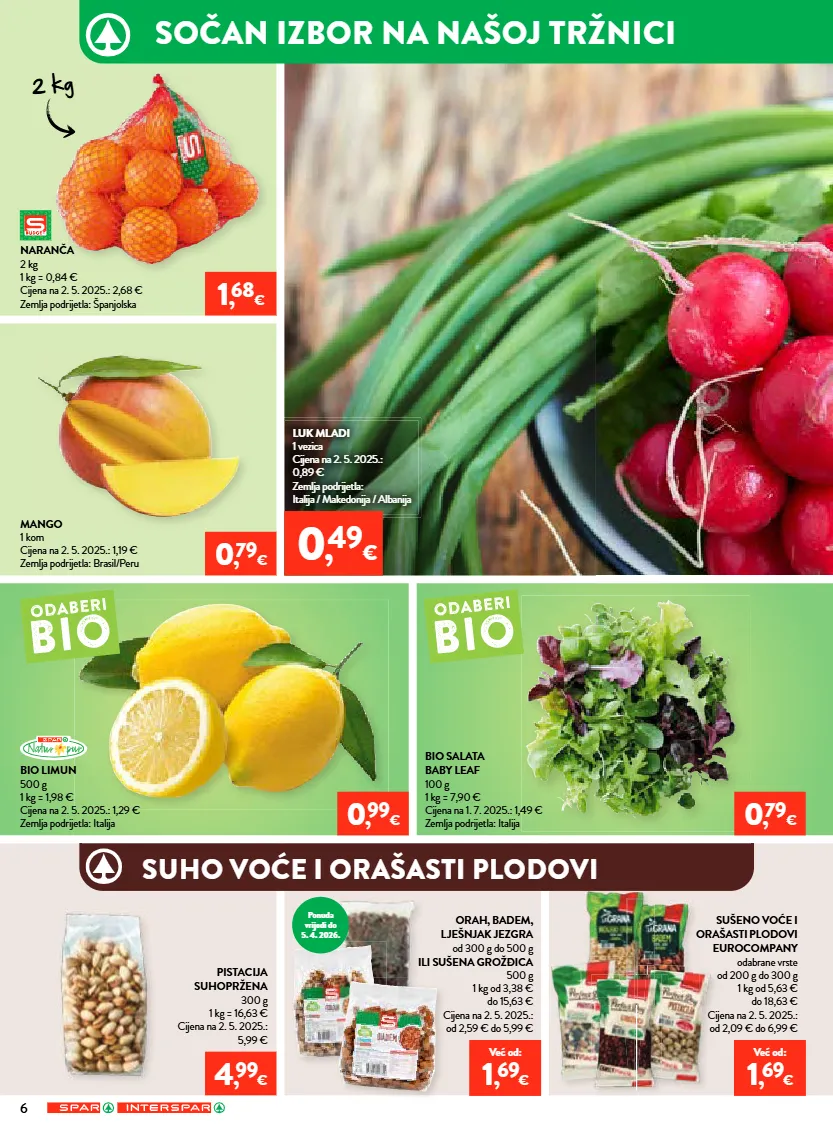 sočan izbor na našoj tržnici 6 mango 1 kom cijena na 2. 5. 2025.: 1,19 € zemlja podrijetla: brasil/peru 0 , 79 € 1 , 68 € luk mladi 1 vezica cijena na 2. 5. 2025.: 0,89 € zemlja podrijetla: italija / makedonija / albanija 0 , 49 € naranča 2 kg 1 kg = 0,84 € cijena na 2. 5. 2025.: 2,68 € zemlja podrijetla: španjolska orah, badem, lješnjak jezgra od 300 g do 500 g ili sušena grožđica 500 g 1 kg od 3,38 € do 15,63 € cijena na 2. 5. 2025.: od 2,59 € do 5,99 € sušeno voće i orašasti plodovi eurocompany odabrane vrste od 200 g do 300 g 1 kg od 5,63 € do 18,63 € cijena na 2. 5. 2025.: od 2,09 € do 6,99 € bio limun 500 g 1 kg = 1,98 € cijena na 2. 5. 2025.: 1,29 € zemlja podrijetla: italija pistacija suhopržena 300 g 1 kg = 16,63 € cijena na 2. 5. 2025.: 5,99 € 0 , 99 € bio salata baby leaf 100 g 1 kg = 7,90 € cijena na 1. 7. 2025.: 1,49 € zemlja podrijetla: italija 0 , 79 € 4 , 99 € već od: 1 , 69 € već od: 1 , 69 € 2 kg ponuda vrijedi do 5. 4. 2026. suho voće i orašasti plodovi