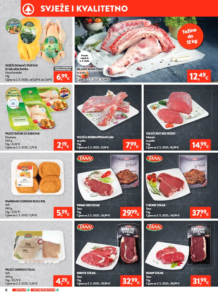 težine do 12 kg 12 , 49 € prime rib steak tann 1 kg cijena na 2. 5. 2025.: 26,99 € tbone steak tann 1 kg cijena na 2. 5. 2025.: 34,99 € teleći but bez kosti frikando na pultu 1 kg cijena na 2. 5. 2025.: 16,99 € 14 , 99 € teleća rebra/prsa/flam na pultu 1 kg cijena na 2. 5. 2025.: 9,59 € 7 , 99 € panirani cordon bleu xxl aia 980 g 1 kg = 5,50 € cijena na 2. 5. 2025.: 5,99 € 5 , 39 € svježi domaći pijetao ili mlada patka vrtovi hrvatske 1 kg cijena na 2. 5. 2025.: od 5,59 € do 7,69 € mlada janjetina na pultu 1 kg cijena na 2. 5. 2025.: 13,99 € pileći batak ili zabatak perutnina 500 g 1 kg = 4,38 € cijena na 2. 5. 2025.: 2,79 € 2 , 19 € ribeye steak tann 1 kg cijena na 2. 5. 2025.: 29,99 € 32 , 99 € 29 , 99 € rump steak tann 1 kg cijena na 2. 5. 2025.: 28,99 € 31 , 99 € 37 , 99 € pileći odresci filea aia 400 g 1 kg = 10,73 € cijena na 2. 5. 2025.: 5,30 € 4 , 29 € samo u interspar hipermarketima 6 , 99 € ponuda vrijedi do 5. 4. 2026. 8 svježe i kvalitetno