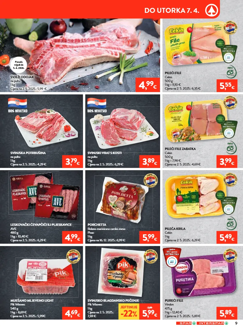 4 , 99 € porchetta rolano marinirano carsko meso pivac 1 kg cijena na 16. 12. 2025.: 6,99 € 5 , 99 € leskovački ćevapčići ili pljeskavice ave 480 g 1 kg = 10,40 € cijena na 2. 5. 2025.: 6,29 € 4 , 99 € svinjski vrat s kosti na pultu 1 kg cijena na 2. 5. 2025.: 6,29 € 3 , 89 € svinjska potrbušina na pultu 1 kg cijena na 2. 5. 2025.: 4,29 € 3 , 79 € 5 , 55 € svježi odojak na pultu 1 kg cijena na 2. 5. 2025.: 5,99 € svinjsko blagdansko pečenje pik vrbovec 1 kg cijena na 2. 5. 2025.: 7,69 € miješano mljeveno light pik vrbovec 540 g 1 kg = 8,69 € cijena na 2. 5. 2025.: 5,99€ 4 , 69 € pureći file vindon 475 g 1 kg = 12,40 € cijena na 2. 5. 2025.: 5,89 € pileća krila cekin 1 kg cijena na 2. 5. 2025.: 6,29 € pileći file zabatka cekin 500 g 1 kg = 7,98 € cijena na 2. 5. 2025.: 4,69 € pileći file cekin 500 g 1 kg = 11,10 € cijena na 2. 5. 2025.: 6,35 € 5 , 89 € 5 , 49 € 3 , 99 € 100% hrvatsko 100% hrvatsko jeftinije -22 % 7,69 5 , 99 € ponuda vrijedi do 5. 4. 2026. 9 do utorka 7. 4.