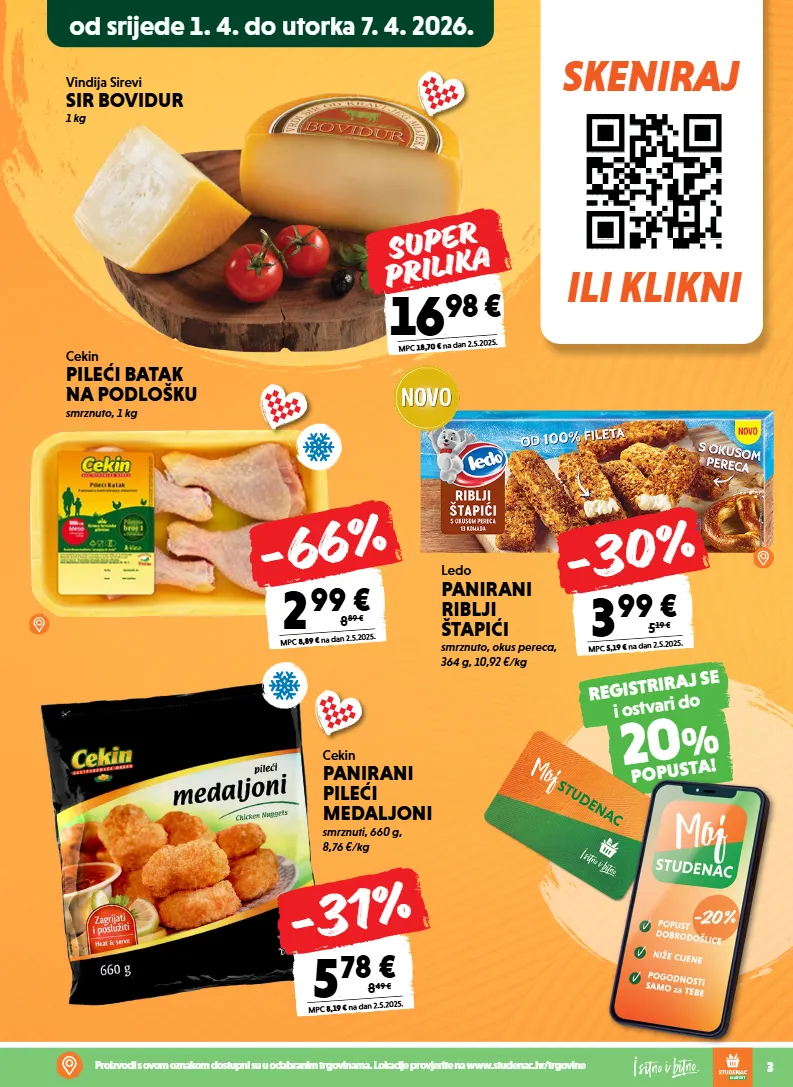 skeniraj ili klikni registriraj se i ostvari do 20 % popusta! 3 proizvodi s ovom oznakom dostupni su u odabranim trgovinama. lokacije provjerite na www.studenac.hr/trgovine cekin pileći batak na podlošku smrznuto, 1 kg 2 , 99 € mpc 8,89 € na dan 2.5.2025. 8 , 8 9 € -66% cekin panirani pileći medaljoni smrznuti, 660 g, 8,76 €/kg 5 , 78 € mpc 8,19 € na dan 2.5.2025. 8 , 4 9 € -31% vindija sirevi sir bovidur 1 kg 16 , 98 € mpc 18,70 € na dan 2.5.2025. super prilika 3 , 99 € mpc 5,19 € na dan 2.5.2025. 5 , 1 9 € -30% ledo panirani riblji štapići smrznuto, okus pereca, 364 g, 10,92 €/kg od srijede 1. 4. do utorka 7. 4. 2026.