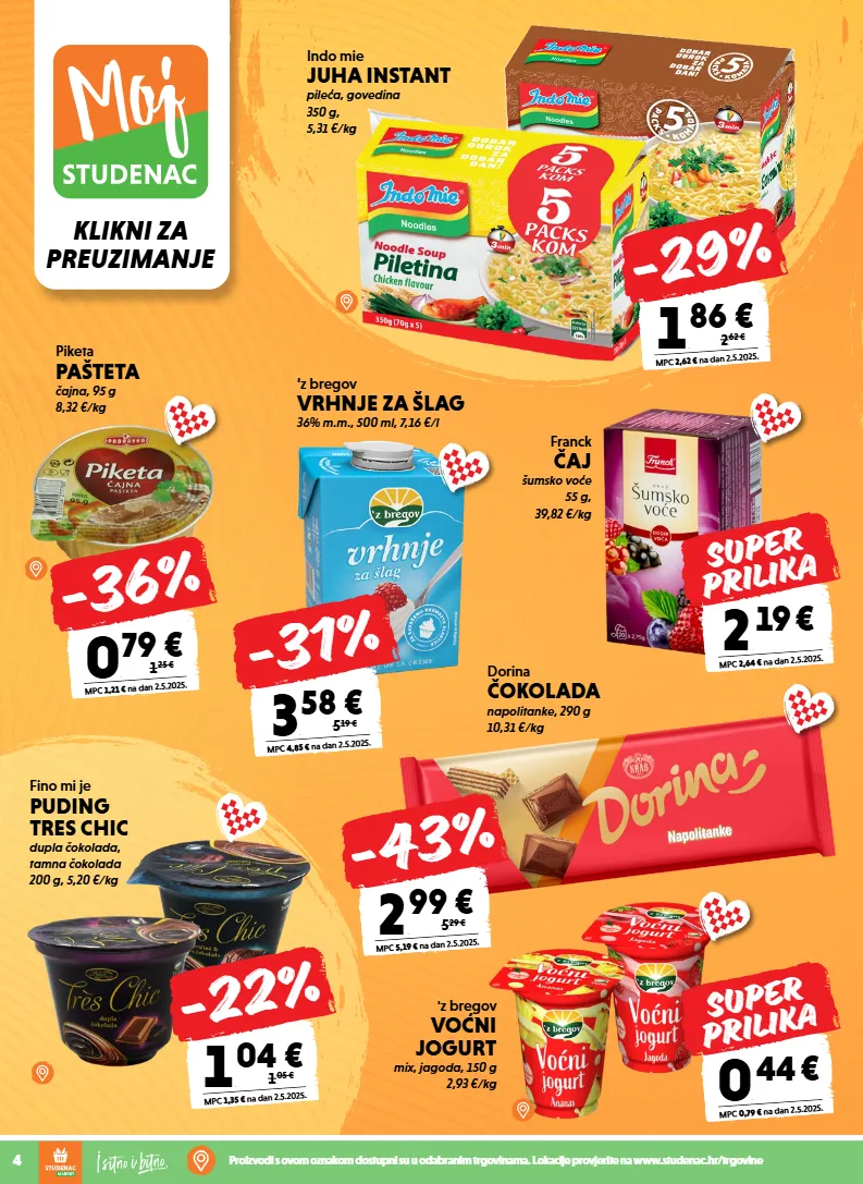 klikni za preuzimanje 4 proizvodi s ovom oznakom dostupni su u odabranim trgovinama. lokacije provjerite na www.studenac.hr/trgovine piketa pašteta čajna, 95 g 8,32 €/kg 0 , 79 € mpc 1,21 € na dan 2.5.2025. 1 , 2 5 € -36% indo mie juha instant pileća, govedina 350 g, 5,31 €/kg 1 , 86 € mpc 2,62 € na dan 2.5.2025. 2 , 6 2 € -29% 'z bregov voćni jogurt mix, jagoda, 150 g 2,93 €/kg franck čaj šumsko voće 55 g, 39,82 €/kg 2 , 19 € mpc 2,64 € na dan 2.5.2025. super prilika dorina čokolada napolitanke, 290 g 10,31 €/kg 2 , 99 € mpc 5,19 € na dan 2.5.2025. 5 , 2 9 € -43% ‘z bregov vrhnje za šlag 36% m.m., 500 ml, 7,16 €/l 3 , 58 € mpc 4,85 € na dan 2.5.2025. 5 , 1 9 € -31% 0 , 44 € mpc 0,79 € na dan 2.5.2025. super prilika fino mi je puding tres chic dupla čokolada, tamna čokolada 200 g, 5,20 €/kg 1 , 04 € mpc 1,35 € na dan 2.5.2025. 1 , 0 5 € -22%
