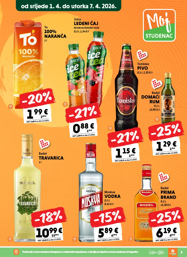 5 proizvodi s ovom oznakom dostupni su u odabranim trgovinama. lokacije provjerite na www.studenac.hr/trgovine juicy ledeni čaj breskva,šumsko voće 0,5 l, 1,76 €/l 0 , 88 € mpc 1,09 € na dan 2.5.2025. 1 , 1 2 € -21% badel domaći rum 0,1 l, 12,90 €/l 1 , 29 € mpc 1,72 € na dan 2.5.2025. 1 , 7 2 € -25% 1 , 99 € mpc 2,49 € na dan 2.5.2025. 2 , 4 9 € -20% to 100% naranča 1 l tomislav pivo 0,5 l, 2,30 €/l 1 , 15 € mpc 1,35 € na dan 2.5.2025. 1 , 4 7 € -21% badel prima brand 0,5 l, 12,38 €/l 6 , 19 € mpc 7,89 € na dan 2.5.2025. 8 , 2 9 € -25% moskva vodka 0,7 l, 8,41 €/l 5 , 89 € mpc 7,52 € na dan 2.5.2025. 6 , 9 9 € -15% badel travarica 1 l 10 , 99 € mpc 13,03 € na dan 2.5.2025. 1 3 , 4 9 € -18% od srijede 1. 4. do utorka 7. 4. 2026.