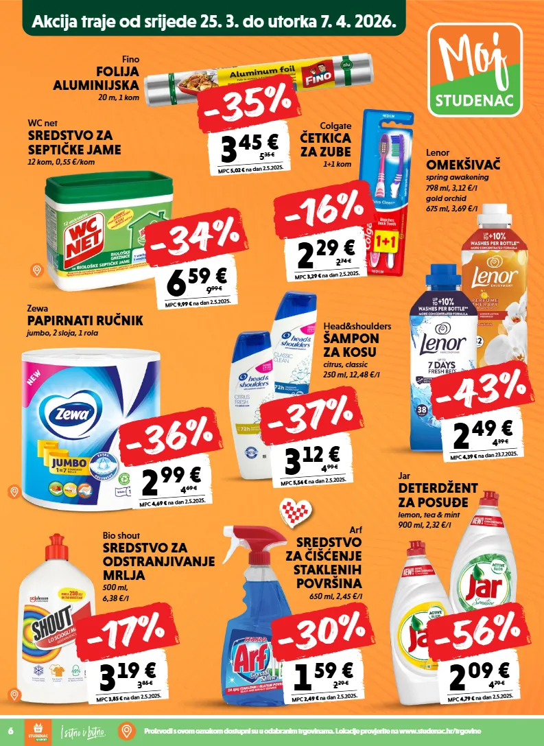 6 proizvodi s ovom oznakom dostupni su u odabranim trgovinama. lokacije provjerite na www.studenac.hr/trgovine zewa papirnati ručnik jumbo, 2 sloja, 1 rola arf sredstvo za čišćenje staklenih površina 650 ml, 2,45 €/l 2 , 99 € mpc 4,69 € na dan 2.5.2025. 4 , 6 9 € -36% head&shoulders šampon za kosu citrus, classic 250 ml, 12,48 €/l wc net sredstvo za septičke jame 12 kom, 0,55 €/kom 6 , 59 € mpc 9,99 € na dan 2.5.2025. 9 , 9 9 € -34% bio shout sredstvo za odstranjivanje mrlja 500 ml, 6,38 €/l jar deterdžent za posuđe lemon, tea & mint 900 ml, 2,32 €/l 2 , 09 € mpc 4,79 € na dan 2.5.2025. 4 , 7 9 € -56% 1 , 59 € mpc 2,49 € na dan 2.5.2025. 2 , 2 9 € -30% 3 , 19 € mpc 3,85 € na dan 2.5.2025. 3 , 8 5 € -17% 3 , 12 € mpc 5,54 € na dan 2.5.2025. 4 , 9 9 € -37% 2 , 49 € mpc 4,39 € na dan 23.7.2025. 4 , 3 9 € -43% lenor omekšivač spring awakening 798 ml, 3,12 €/l gold orchid 675 ml, 3,69 €/l colgate četkica za zube 1+1 kom 2 , 29 € mpc 3,29 € na dan 2.5.2025. 2 , 7 4 € -16% fino folija aluminijska 20 m, 1 kom 3 , 45 € mpc 5,02 € na dan 2.5.2025. 5 , 3 5 € -35% akcija traje od srijede 25. 3. do utorka 7. 4. 2026.