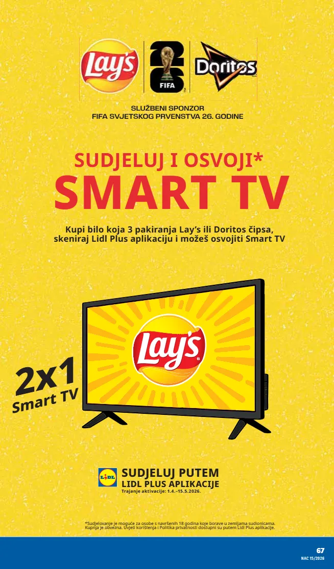 2x1 smart tv *sudjelovanje je mogu ć e za osobe s navršenih 18 godina koje borave u zemljama sudionicama. kupnja je obvezna. uvjeti korištenja i politika privatnosti dostupni su putem lidl plus aplikacije. kupi bilo koja 3 pakiranja lay’s ili doritos č ipsa, skeniraj lidl plus aplikaciju i možeš osvojiti smart tv sudjeluj i osvoji* smart tv sudjeluj putem lidl plus aplikacije trajanje aktivacije: 1.4.–15.5.2026. 67 nac 15/2026