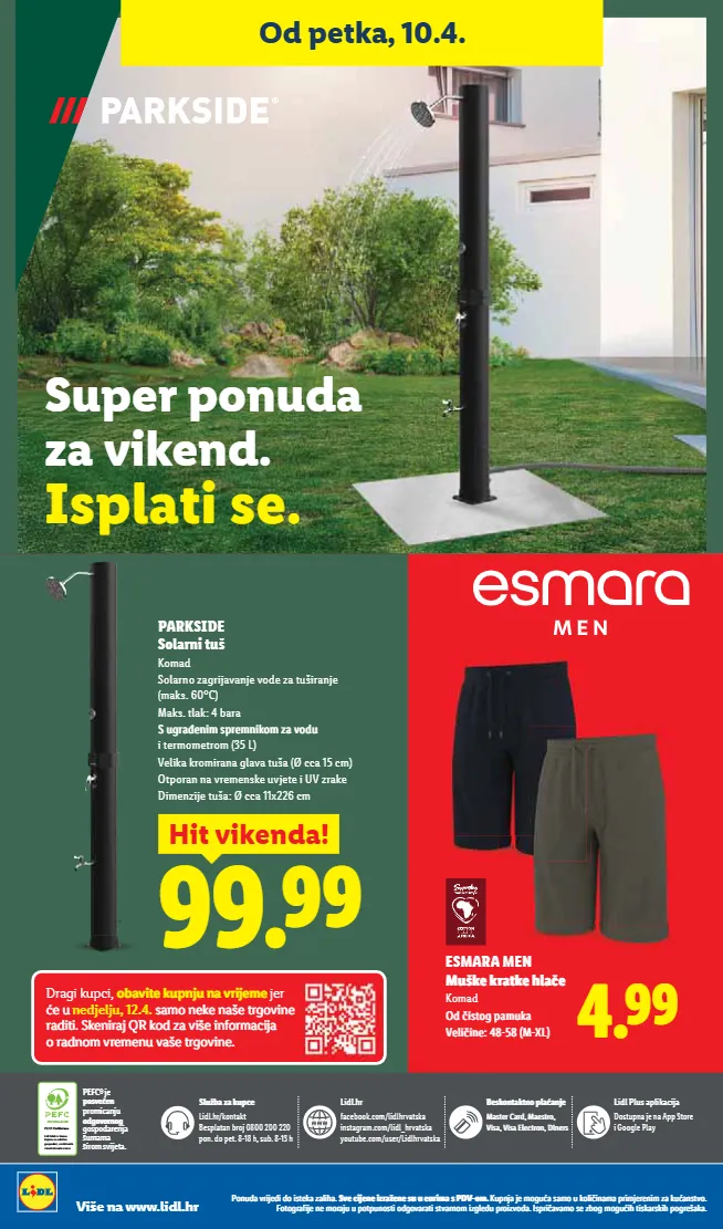 Lidl Plus aplikacija Dostupna je na App Store i Google Play Lidl.hr facebook.com/lidlhrvatska instagram.com/lidl_hrvatska youtube.com/user/Lidlhrvatska ¨óÏàÙúÏúȖàìÒŲ̀ Cóú¨ïï¤İC¨óúȞàİ tÀóİtÀóÒ¨úȞàÙİÀÙ¨ïó ]ÒÿęėÏÿì¨ Lidl.hr/kontakt Besplatan broj 0800 200 220 pon. do pet. 8-18 h, sub. 8-13 h PEFC Certificirano ! " # " " # PEFC® je ìàóĊ¨¨Ù promicanju सàĊàïȖภgospodarenja šumama širom svijeta. Dragi kupci, àĊÀú¨ÏÿìÙÌÿÙĊïĄ̏ب jer ¨ÿ nedjelju, 12.4. óØà٨ϨÙõ¨úȞ¸àĊÀÙ¨ ï¤ÀúȀı]ϨÙÀïÌXYÏà¤ėĊÀõ¨ÀÙ³àïȕÀÌ àï¤ÙàØĊï¨Ø¨ÙÿĊõ¨úȞ¸àĊÀÙ¨ı Od petka, 10.4. Super ponuda za vikend. .óìÒúȀó¨ı PARKSIDE Solarni tuš Komad Solarno zagrijavanje vode za tuširanje (maks. 60°C) Maks. tlak: 4 bara ]ÿ¸ï¦¨ÙÀØóìï¨ØÙÀÏàØėĊà¤ÿ i termometrom (35 L) Velika kromirana glava tuša (Ø cca 15 cm) Otporan na vremenske uvjete i UV zrake Dimenzije tuša: Ø cca 11x226 cm l=ÒÒ Hit vikenda! V=¬¬ ESMARA MEN CÿõϨÏïúϨ½Ò ¨ Komad J¤ Àóúà¸ìØÿÏ t¨ÒÀ ÀÙ¨ijƠƤƗơƤƍCƗz=Ǝ V=¬¬ ǮàȖȢǽdzĊȞȀȌ¨ǽȀǽàȀóú¨ÏdzėdzȏȀ½dzı ]Ċ¨ȀȌ¨Ȗ¨ȀėȞdzę¨Ȗ¨óȢȢ¨ȢȞȀȕdzóǮǟtƗàȕı ;ȢȝȖȌdzȌ¨ȕà¸ȢdzódzȕàȢÏàȏȀ ȀȖdzȕdzȝȞȀȕȌ¨Ȟ¨ȖȀȕėdzÏȢdzȖóúĊàı %àúà¸Ȟdz³ȀȌ¨Ȗ¨ȕàȞdzȌȢȢȝàúȝȢȖàóúȀàǽ¸àĊdzȞdzúȀóúĊdzȞȖàȕȀė¸ȏ¨ǽȢȝȞàȀėĊàǽdzıǣóȝȞȀ dzĊdzȕàó¨ėà¸ȕà¸ȢȀ½úȀóÏdzȞóÏȀ½ȝà¸Ȟ¨õdzÏdzı Više na www.lidl.hr