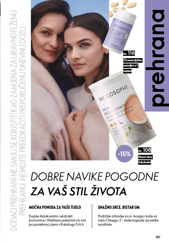 section name 107 prehrana 107 -15% str. 108 str. 116 22 esencijalna sastojka u 1 tableti slasni okus čokolade! moćna ponuda za vaše tijelo snažno srce, bistar um podržite zdravlje srca, mozga i kože uz našu omegu-3 – male kapsule za velike rezultate. kupite astaksantin i ekstrakt borovnice i wellness paket bit će vaš po posebnoj cijeni u katalogu 5 ili 6 dodaci prehrani ne smiju se koristiti kao zamjena za uravnoteženu prehranu. nemojte prekoračiti preporučenu dnevnu dozu. dobre navike pogodne za vaš stil života