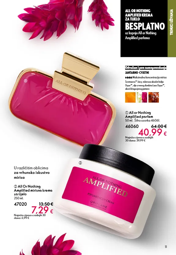 11 a all or nothing amplified parfem 50 ml. šifra uzorka 46061. 46060 64,00 € 40,99 € najniža cijena u zadnjih 30 dana: 39,99 € b all or nothing amplified mirisna krema za tijelo 250 ml. 47020 13,50 € 7,29 € najniža cijena u zadnjih 30 dana: 6,99 € scentaurus™ juicy, tuberoza absolut indija orpur™, ulje crvenog đumbira laos orpur™, akord dragocjenog jantara maksimalna koncentracija mirisa jantarno-cvjetni odvažan i pun samopouzdanja u različitim oblicima za vrhunsko iskustvo mirisa trenuci uživanja all or nothing amplified krema za tijelo besplatno uz kupnju all or nothing amplified parfema a b