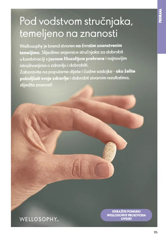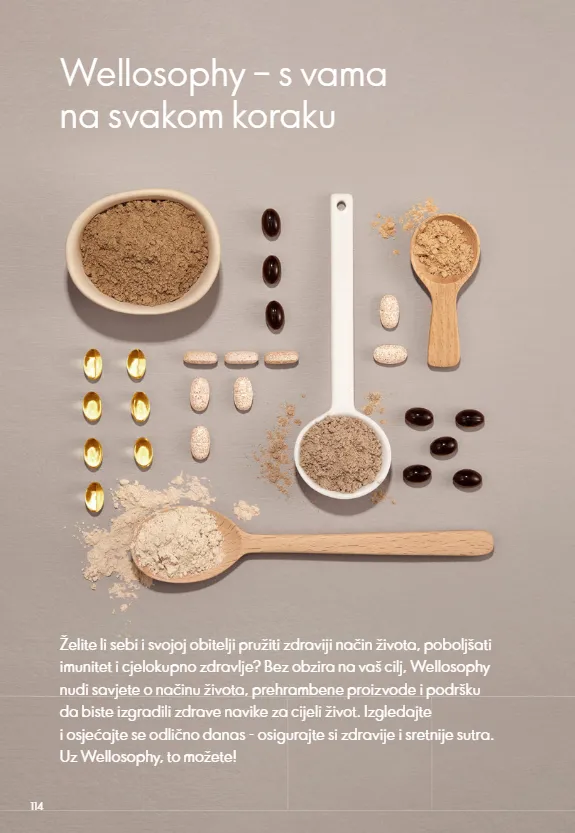 114 Wellosophy – s vama na svakom koraku Želite li sebi i svojoj obitelji pružiti zdraviji način života, poboljšati imunitet i cjelokupno zdravlje? Bez obzira na vaš cilj, Wellosophy nudi savjete o načinu života, prehrambene proizvode i podršku da biste izgradili zdrave navike za cijeli život. Izgledajte i osjećajte se odlično danas - osigurajte si zdravije i sretnije sutra. Uz Wellosophy, to možete!