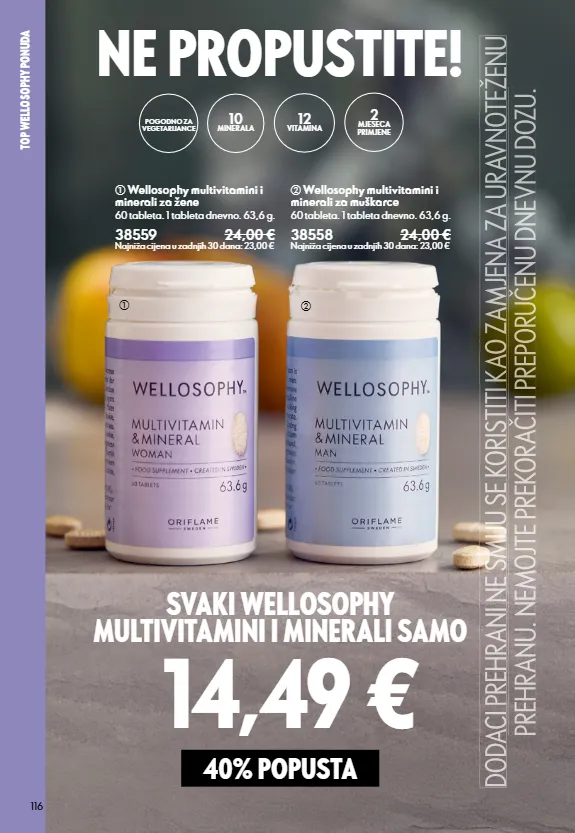 116 NE PROPUSTITE! DODACI PREHRANI NE SMIJU SE KORISTITI KAO ZAMJENA ZA URAVNOTEŽENU PREHRANU. NEMOJTE PREKORAČITI PREPORUČENU DNEVNU DOZU. TOP WELLOSOPHY PONUDA 2 MJESECA PRIMJENE POGODNO ZA VEGETARIJANCE 10 MINERALA 12 VITAMINA SVAKI WELLOSOPHY MULTIVITAMINI I MINERALI SAMO 40% POPUSTA a Wellosophy multivitamini i minerali za žene 60 tableta. 1 tableta dnevno. 63,6 g. 38559 24,00 € Najniža cijena u zadnjih 30 dana: 23,00 € b Wellosophy multivitamini i minerali za muškarce 60 tableta. 1 tableta dnevno. 63,6 g. 38558 24,00 € Najniža cijena u zadnjih 30 dana: 23,00 € a b 14,49€