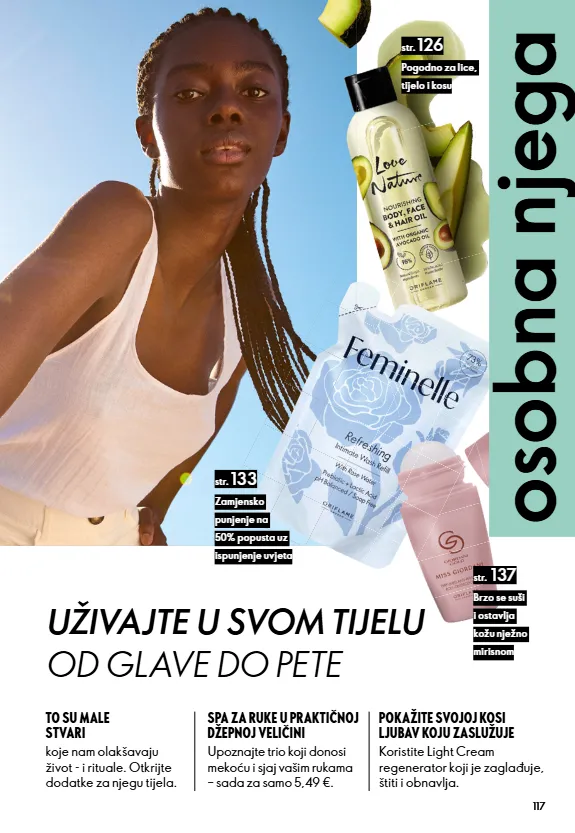 117 117 osobna njega str. 133 str. 126 str. 137 Pogodno za lice, tijelo i kosu Brzo se suši i ostavlja kožu nježno mirisnom Zamjensko punjenje na 50% popusta uz ispunjenje uvjeta UŽIVAJTE U SVOM TIJELU OD GLAVE DO PETE TO SU MALE STVARI SPA ZA RUKE U PRAKTIČNOJ DŽEPNOJ VELIČINI POKAŽITE SVOJOJ KOSI LJUBAV KOJU ZASLUŽUJE Koristite Light Cream regenerator koji je zaglađuje, štiti i obnavlja. koje nam olakšavaju život - i rituale. Otkrijte dodatke za njegu tijela. Upoznajte trio koji donosi mekoću i sjaj vašim rukama – sada za samo 5,49 €.