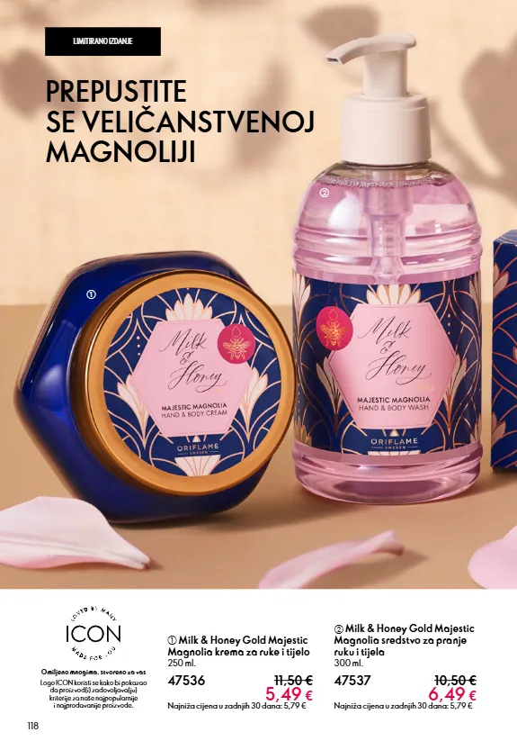 118 b milk & honey gold majestic magnolia sredstvo za pranje ruku i tijela 300 ml. 47537 10,50 € 6,49 € najniža cijena u zadnjih 30 dana: 5,79 € a milk & honey gold majestic magnolia krema za ruke i tijelo 250 ml. 47536 11,50 € 5,49 € najniža cijena u zadnjih 30 dana: 5,79 € limitirano izdanje prepustite se veličanstvenoj magnoliji logo icon koristi se kako bi pokazao da proizvod(i) zadovoljava(ju) kriterije za naše najpopularnije i najprodavanije proizvode. omiljeno mnogima, stvoreno za vas a b