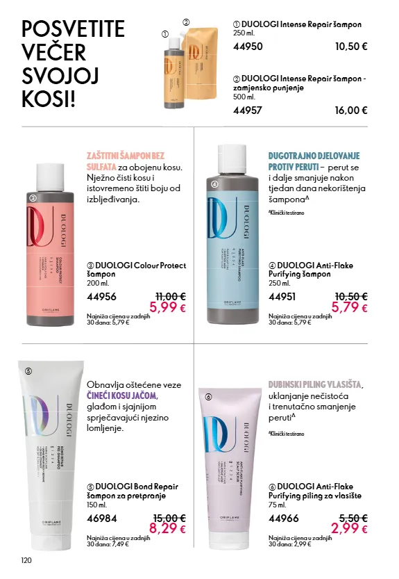 120 a DUOLOGI Intense Repair šampon 250 ml. 44950 10,50 € b DUOLOGI Intense Repair šampon - zamjensko punjenje 500 ml. 44957 16,00 € c DUOLOGI Colour Protect šampon 200 ml. 44956 11,00 € 5,99 € Najniža cijena u zadnjih 30 dana: 5,79 € e DUOLOGI Bond Repair šampon za pretpranje 150 ml. 46984 15,00 € 8,29 € Najniža cijena u zadnjih 30 dana: 7,49 € d DUOLOGI Anti-Flake Purifying šampon 250 ml. 44951 10,50 € 5,79 € Najniža cijena u zadnjih 30 dana: 5,79 € f DUOLOGI Anti-Flake Purifying piling za vlasište 75 ml. 44966 5,50 € 2,99 € Najniža cijena u zadnjih 30 dana: 2,99 € ∆ Klinički testirano POSVETITE VEČER SVOJOJ KOSI! Obnavlja oštećene veze ČINEĆI KOSU JAČOM, glađom i sjajnijom sprječavajući njezino lomljenje. DUGOTRAJNO DJELOVANJE PROTIV PERUTI – perut se i dalje smanjuje nakon tjedan dana nekorištenja šampona ∆ ∆ Klinički testirano ZAŠTITNI ŠAMPON BEZ SULFATA za obojenu kosu. Nježno čisti kosu i istovremeno štiti boju od izbljeđivanja. DUBINSKI PILING VLASIŠTA , uklanjanje nečistoća i trenutačno smanjenje peruti ∆ a b e d c f