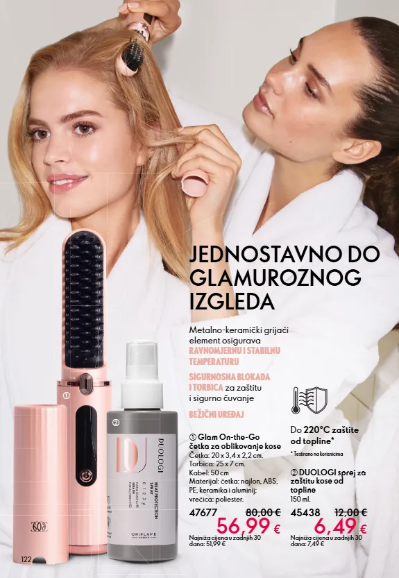 50% recycled plastic bottle Up to 220°C heat protection 122 JEDNOSTAVNO DO GLAMUROZNOG IZGLEDA Metalno-keramički grijaći element osigurava RAVNOMJERNU I STABILNU TEMPERATURU SIGURNOSNA BLOKADA I TORBICA za zaštitu i sigurno čuvanje BEŽIČNI UREĐAJ a Glam On-the-Go četka za oblikovanje kose Četka: 20 x 3,4 x 2,2 cm. Torbica: 25 x 7 cm. Kabel: 50 cm Materijal: četka: najlon, ABS, PE, keramika i aluminij; vrećica: poliester. 47677 80,00 € 56,99 € Najniža cijena u zadnjih 30 dana: 51,99 € b DUOLOGI sprej za zaštitu kose od topline 150 ml. 45438 12,00 € 6,49 € Najniža cijena u zadnjih 30 dana: 7,49 € Do 220°C zaštite od topline* * Testirano na korisnicima a b
