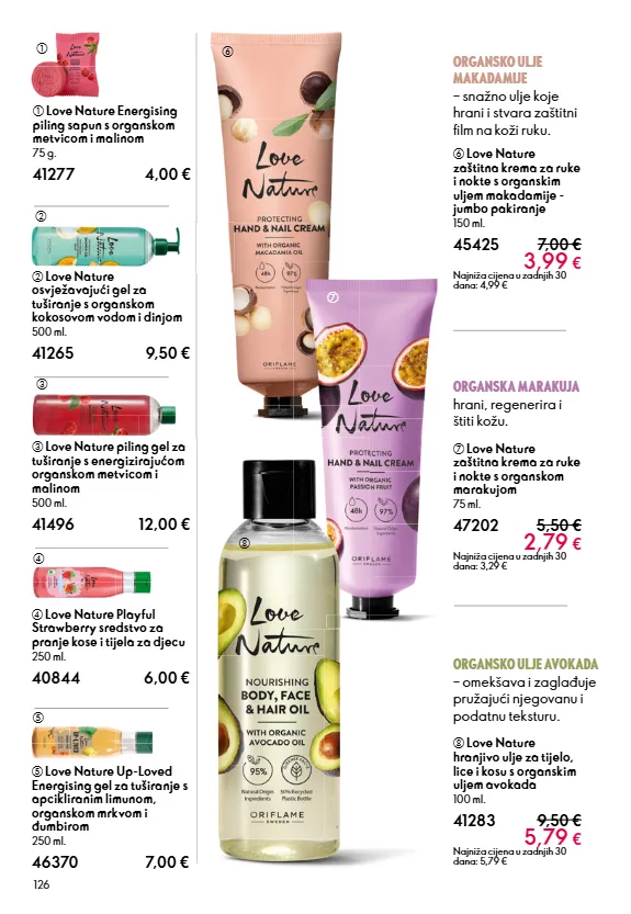 126 f love nature zaštitna krema za ruke i nokte s organskim uljem makadamije - jumbo pakiranje 150 ml. 45425 7,00 € 3,99 € najniža cijena u zadnjih 30 dana: 4,99 € organsko ulje makadamije – snažno ulje koje hrani i stvara zaštitni film na koži ruku. g love nature zaštitna krema za ruke i nokte s organskom marakujom 75 ml. 47202 5,50 € 2,79 € najniža cijena u zadnjih 30 dana: 3,29 € organska marakuja hrani, regenerira i štiti kožu. h love nature hranjivo ulje za tijelo, lice i kosu s organskim uljem avokada 100 ml. 41283 9,50 € 5,79 € najniža cijena u zadnjih 30 dana: 5,79 € organsko ulje avokada – omekšava i zaglađuje pružajući njegovanu i podatnu teksturu. e love nature up-loved energising gel za tuširanje s apcikliranim limunom, organskom mrkvom i đumbirom 250 ml. 46370 7,00 € c love nature piling gel za tuširanje s energizirajućom organskom metvicom i malinom 500 ml. 41496 12,00 € a love nature energising piling sapun s organskom metvicom i malinom 75 g. 41277 4,00 € b love nature osvježavajući gel za tuširanje s organskom kokosovom vodom i dinjom 500 ml. 41265 9,50 € d love nature playful strawberry sredstvo za pranje kose i tijela za djecu 250 ml. 40844 6,00 € f g h a b c d e