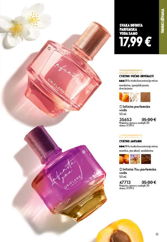 13 trenuci uživanja 17,99€ a infinita parfemska voda 50 ml. 35653 35,00 € najniža cijena u zadnjih 30 dana: 17,99 € b infinita you parfemska voda 50 ml. 47713 35,00 € najniža cijena u zadnjih 30 dana: 17,99 € vrlo visoka koncentracija mirisa vedar i pun energije cvjetno-jantarni marelica, you akord, sandalovina vedar i pun energije cvjetno-voćno-drvenasti vrlo visoka koncentracija mirisa mandarina, španjolski jasmin, drvo kašmira svaka infinita parfemska voda samo a b