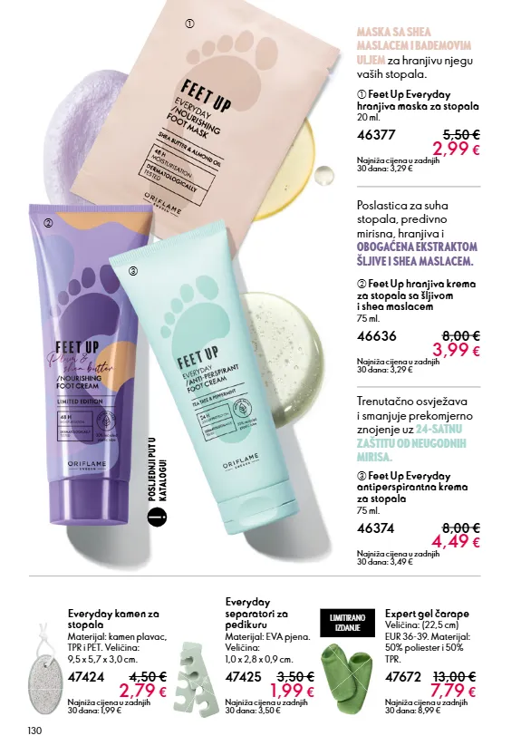 130 Expert gel čarape Veličina: (22,5 cm) EUR 36-39. Materijal: 50% poliester i 50% TPR. 47672 13,00 € 7,79 € Najniža cijena u zadnjih 30 dana: 8,99 € Everyday separatori za pedikuru Materijal: EVA pjena. Veličina: 1,0 x 2,8 x 0,9 cm. 47425 3,50 € 1,99 € Najniža cijena u zadnjih 30 dana: 3,50 € Everyday kamen za stopala Materijal: kamen plavac, TPR i PET. Veličina: 9,5 x 5,7 x 3,0 cm. 47424 4,50 € 2,79 € Najniža cijena u zadnjih 30 dana: 1,99 € LIMITIRANO IZDANJE c Feet Up Everyday antiperspirantna krema za stopala 75 ml. 46374 8,00 € 4,49 € Najniža cijena u zadnjih 30 dana: 3,49 € POSLJEDNJI PUT U KATALOGU! a Feet Up Everyday hranjiva maska za stopala 20 ml. 46377 5,50 € 2,99 € Najniža cijena u zadnjih 30 dana: 3,29 € b Feet Up hranjiva krema za stopala sa šljivom i shea maslacem 75 ml. 46636 8,00 € 3,99 € Najniža cijena u zadnjih 30 dana: 3,29 € Trenutačno osvježava i smanjuje prekomjerno znojenje uz 24-SATNU ZAŠTITU OD NEUGODNIH MIRISA. Poslastica za suha stopala, predivno mirisna, hranjiva i OBOGAĆENA EKSTRAKTOM ŠLJIVE I SHEA MASLACEM. MASKA SA SHEA MASLACEM I BADEMOVIM ULJEM za hranjivu njegu vaših stopala. a b c