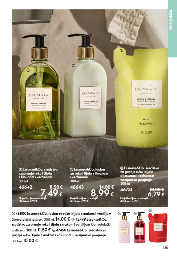 135 OSOBNA NJEGA c Essense&Co. sredstvo za pranje ruku i tijela s limunom i verbenom - zamjensko punjenje 300 ml. 46731 10,00 € 6,79 € Najniža cijena u zadnjih 30 dana: 5,29 € b Essense&Co. losion za ruke i tijelo s limunom i verbenom 300 ml. 46643 14,00 € 8,99 € Najniža cijena u zadnjih 30 dana: 7,99 € a Essense&Co. sredstvo za pranje ruku i tijela s limunom i verbenom 300 ml. 46642 11,50 € 7,49 € Najniža cijena u zadnjih 30 dana: 5,99 € d 45800 Essense&Co. losion za ruke i tijelo s makom i vanilijom Dermatološki testiran. 300 ml. 14,00€ e 45799 Essense&Co. sredstvo za pranje ruku i tijela s makom i vanilijom Dermatološki testirano. 300 ml. 11,50€ f 47450 Essense&Co. sredstvo za pranje ruku i tijela s makom i vanilijom – zamjensko punjenje 300 ml. 10,00€ a b c f d e
