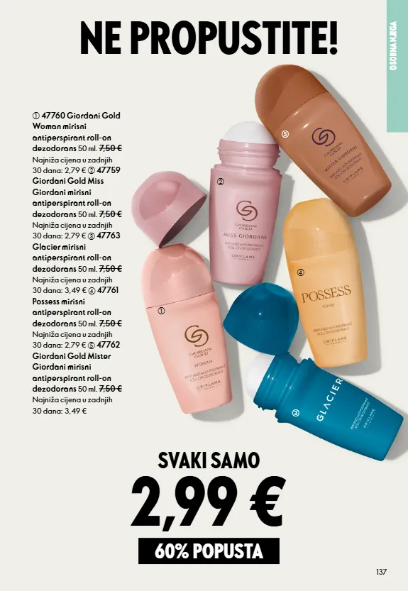 a b d c e 137 osobna njega 2,99 € ne propustite! a 47760 giordani gold woman mirisni antiperspirant roll-on dezodorans 50 ml. 7,50 € najniža cijena u zadnjih 30 dana: 2,79 € b 47759 giordani gold miss giordani mirisni antiperspirant roll-on dezodorans 50 ml. 7,50 € najniža cijena u zadnjih 30 dana: 2,79 € c 47763 glacier mirisni antiperspirant roll-on dezodorans 50 ml. 7,50 € najniža cijena u zadnjih 30 dana: 3,49 € d 47761 possess mirisni antiperspirant roll-on dezodorans 50 ml. 7,50 € najniža cijena u zadnjih 30 dana: 2,79 € e 47762 giordani gold mister giordani mirisni antiperspirant roll-on dezodorans 50 ml. 7,50 € najniža cijena u zadnjih 30 dana: 3,49 € svaki samo 60% popusta