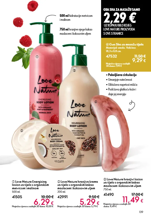 139 750 ml hranjive njege kakao maslacem i kokosovim uljem 500 ml hidratacije metvicom i malinom a love nature energising losion za tijelo s organskom metvicom i malinom 500 ml. 41505 10,00 € 6,29 € najniža cijena u zadnjih 30 dana: 10,00 € c love nature hranjivi losion za tijelo s organskim kakao maslacem i kokosovim uljem 750 ml. 41490 17,00 € 11,49 € najniža cijena u zadnjih 30 dana: 11,49 € b love nature hranjiva krema za tijelo s organskim kakao maslacem i kokosovim uljem 200 ml. 42991 9,50 € 5,29 € najniža cijena u zadnjih 30 dana: 5,79 € d gua sha za masažu tijela materijal: smola. veličina: 18,3 x 0,8 cm. 47532 11,50 € 9,29 € najniža cijena u zadnjih 30 dana: 7,99 € gua sha za masažu samo 2,29 € uz kupnju bilo kojeg love nature proizvoda s ove stranice • poboljšava cirkulaciju • umanjuje natečenost • ublažava napetost mišića • podržava glatkoću kože i daje joj energiju a c b d