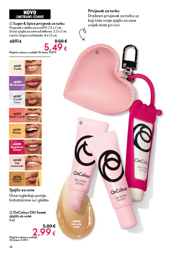14 b oncolour oh! sweet sjajilo za usne 8 ml. 5,00 € 2,99 € najniža cijena u zadnjih 30 dana: 2,49 € novo limitirano izdanje a sugar & spice privjesak za torbu privjesak u obliku srca od pu: 7,5 x 7 cm. držač sjajila za usne od silikona: 3,2 x 2 cm. lančić i kopča od metala: 4 x 1,5 cm. 48914 9,00 € 5,49 € najniža cijena u zadnjih 30 dana: 9,00 € dražesni privjesak za torbu uz koji ćete svoje sjajilo za usne uvijek imati pri ruci. usne izgledaju punije, hidratizirane su i glatke privjesak za torbu sjajilo za usne a b 46591 vanilla 46592 peach candy 46593 blackcurrant 46594 dulce de leche 46594 dulce de leche 46589 mango 46587 crystal coco 46590 raspberry cream 46588 pink lemonade